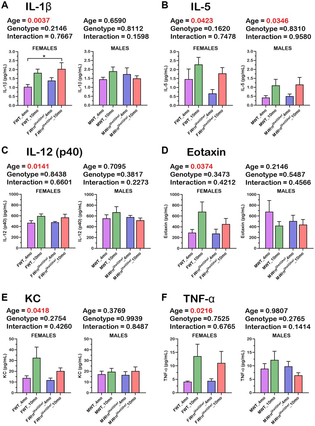Since cytokines of the immune system were not detected in the serum of our mouse cohort by mass spectrometry analysis, we measured 23 serum cytokines using a multiplex assay kit (as described in Materials and Methods). The histograms in the Figure 11A–11F show that six cytokines exhibited a significant difference between four- and ten-months old females independently of the WrnΔhel/Δhel genotype (two-way ANOVA p-values < 0.05). These cytokines included IL-1ß, IL-5, IL-12 (p40 subunit), Eotaxin, KC, and TNF-α. The fold increase in ten months old females compared to four months old females varied from 1.2-fold (for IL-12 (p40 subunit) in Figure 11C) to 3.3-fold (for TNF-α in Figure 11F). Additional Tukey test on these cytokines indicated a significant two-fold increase in WrnΔhel/Δhel females at ten months of age compared to wild type females at four months of age (Figure 11A). IL-5 was the only cytokine that showed a significant difference based on age in the males (Figure 11B) independently of the WrnΔhel/Δhel genotype (two-way ANOVA p-values < 0.05). No significant difference was observed between the various groups of WrnΔhel/Δhel and wild type males for all the other analyzed cytokines. Finally, three-way ANOVA did not show a sex dependent effect on the serum levels of the analyzed cytokines.
