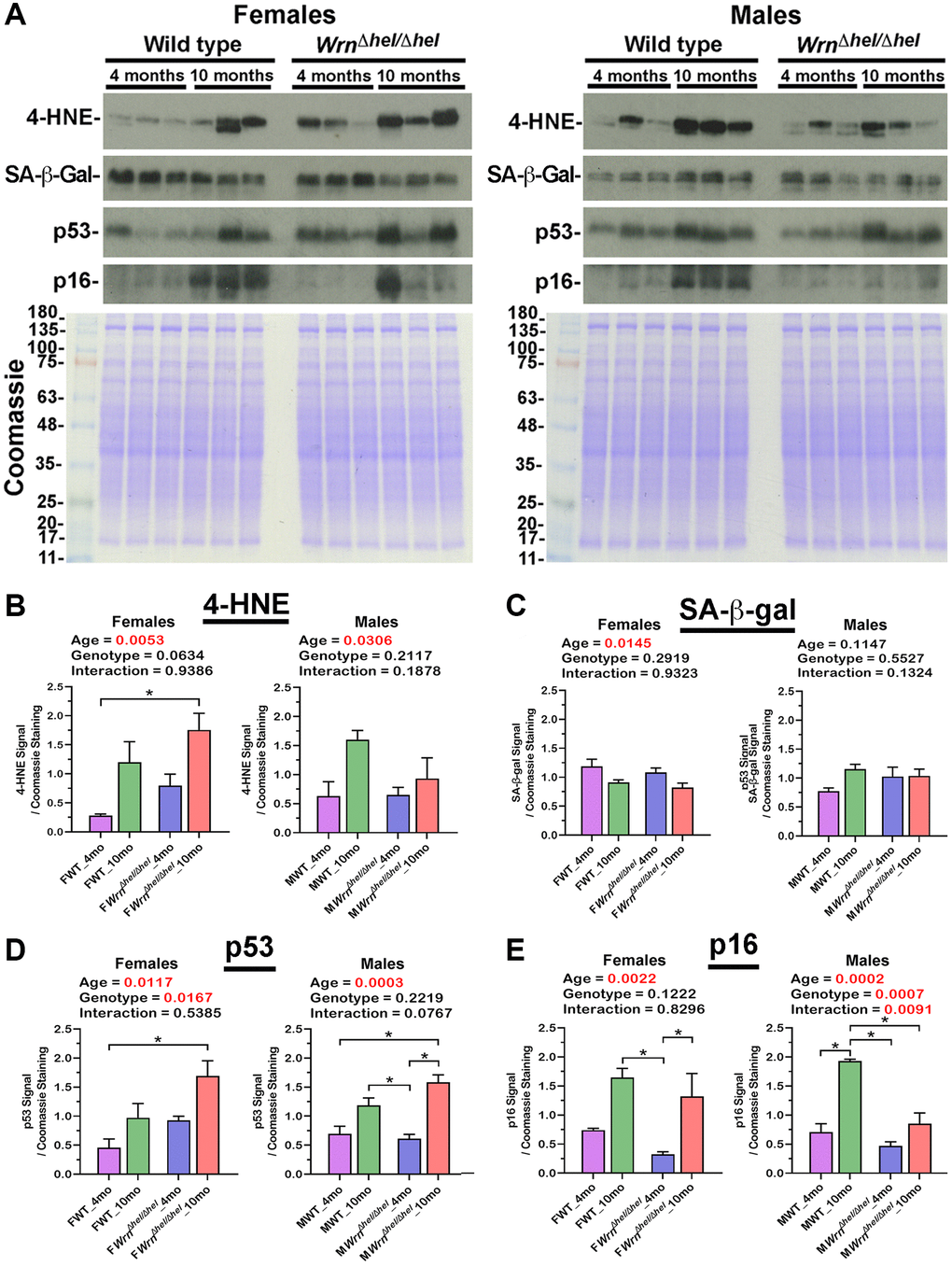 Abnormal accumulation of lipids in the liver can increase lipid peroxidation, protein damage, and stress induced senescence of hepatocytes [29]. Western blot analyses were thus performed to assess the levels of 4-hydroxynonenal (4-HNE)-protein adducts and the levels of senescence markers such as senescence-associated ß-galactosidase (SA-ß-gal), p53, and p16 proteins in both female and male groups. Examples of western blots for these markers are shown in Figure 12A. The levels of 4-HNE-protein adducts were increased by four and two-fold in the liver of ten months old WrnΔhel/Δhel and wild type females compared to four months old WrnΔhel/Δhel and wild type females, respectively. Two-way ANOVA indicated that age affected 4-HNE-protein adducts in females (page = 0.0053). Additional Tukey test indicated a significant difference between four months old wild type and ten months old WrnΔhel/Δhel females (Tukey test *p < 0.05 in the graph of Figure 12B). Two-way ANOVA on the different male groups also indicated that age affected 4-HNE-protein adducts (page = 0.0306). However, the difference between four and ten months old wild type and WrnΔhel/Δhel males were less than 2.5 and 1.4-fold, respectively (Figure 12B).