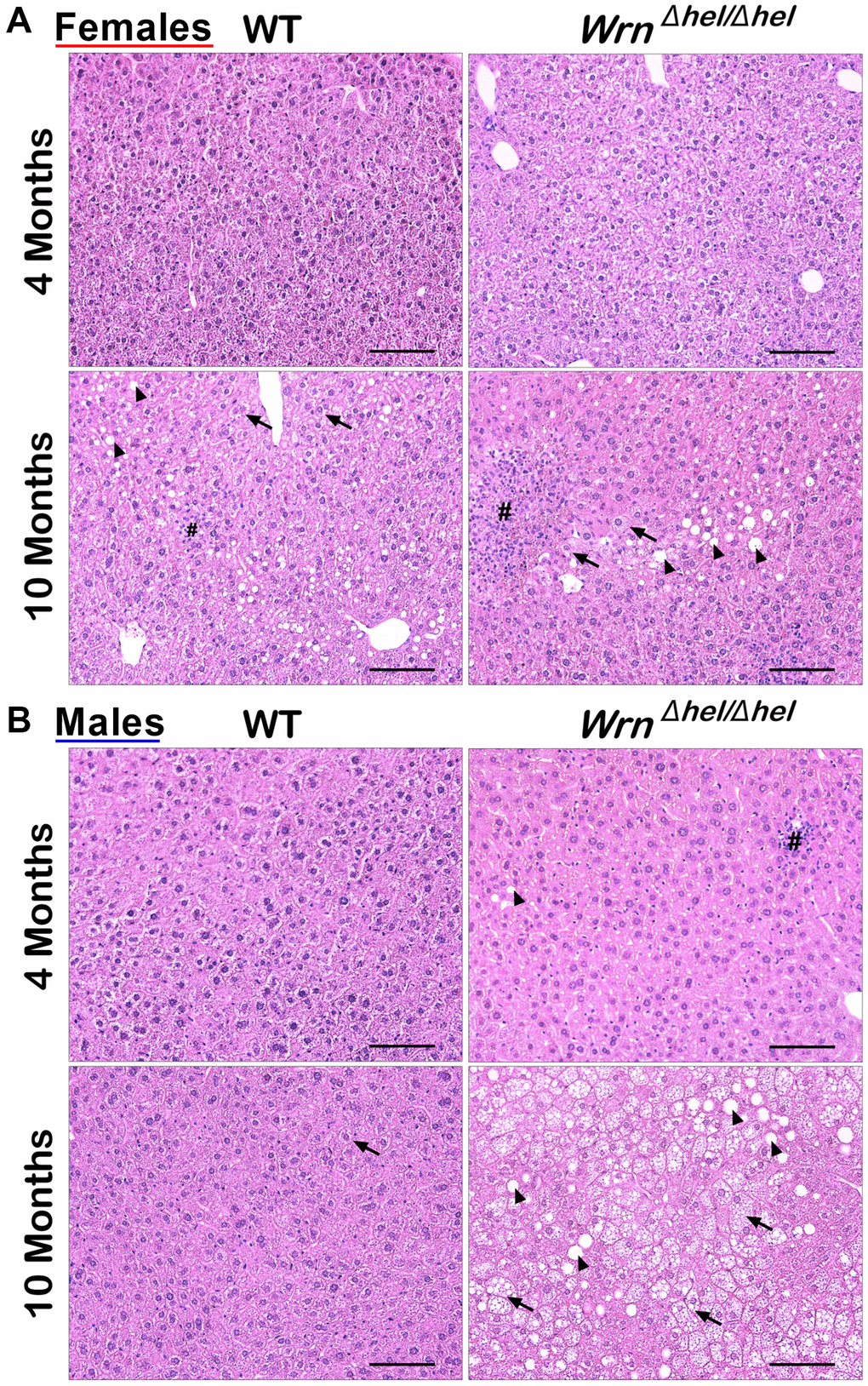 Previous studies on the liver tissue of WrnΔhel/Δhel males indicated an increased stress in the endoplasmic reticulum of young mice (four months old) compared to age-matched wild type males [22] and an increase in inflammatory cell aggregates in the liver of older (> 14 months old) males [18]. In the present study, we analyzed the proteome profiles of the whole liver and the serum of these animals in both males and females at four and ten months of age (young and middle-aged mice) to gain additional information on the biological processes that are altered in the hepatic tissue of WrnΔhel/Δhel mice. We focused on four- and ten-months old animals as a previous analysis indicated approximately 11% of WrnΔhel/Δhel mice exhibited different types of tumors (including liver tumors) before the age of twelve months [23]. Figure 1 provides the experimental design of the study. There were four different groups for male and female mice. First, hematoxylin and eosin staining were performed on the liver of four to six males and females per group. Hepatocellular steatosis is classified into two types: macrovesicular and microvesicular. In macrovesicular steatosis, a single large fat droplet or smaller well-defined fat droplets occupy the cytoplasm of hepatocytes, pushing the nucleus to the periphery (as exemplified in Figure 1). In microvesicular steatosis, the cytoplasm of hepatocytes is filled with tiny lipid droplets (as depicted in Figure 1). Steatosis in NAFLD is usually macrovesicular; however, microvesicular steatosis may also be present [24]. The presence of microvesicular steatosis is associated with higher grades of steatosis and correlates with more advanced histology of NAFLD [25]. Figure 2 provides representative examples of histological images for wild type and WrnΔhel/Δhel females and males at four and ten months of age. The number of macrovesicles (see arrowheads in Figure 2), the percentage of hepatocytes with microvesicles (see arrows in Figure 2), and the number of inflammatory cell aggregates (see # in Figure 2) were counted in all the histological images. Two-way ANOVA followed by Tukey’s multiple comparisons test were performed to determine the effect of age and/or genotype on these histological parameters. Age had a significant effect on the number of macrovesicles in the females (two-way ANOVA p-value < 0.0001 in Figure 3A). Indeed, the number of macrovesicles was increased by 59- and 26-fold in wild type and WrnΔhel/Δhel females at ten months compared to females at four months of age, respectively (Tukey test *p < 0.05 in the graph of Figure 3A). The number of macrovesicles was significantly increased by 17- and eight-fold in the liver of wild type and WrnΔhel/Δhel males at ten months compared to males at four months of age (Tukey test *p < 0.05 in the graph of Figure 3A). However, ten months old WrnΔhel/Δhel males had twice as many macrovesicles in their liver than ten months old wild type males (Tukey test *p < 0.05). Accordingly, the two-way ANOVA revealed an interaction between age and genotype on the number of macrovesicles in the liver of males (two-way ANOVA pinteraction = 0.0394 in Figure 3A).