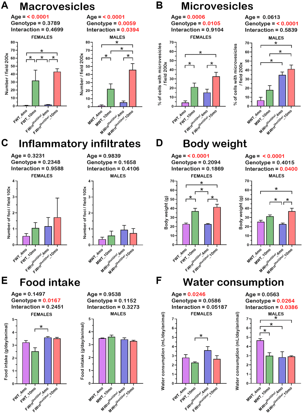 Mice were weighed and compared between groups. As indicated in Figure 3D, wild type and WrnΔhel/Δhel males and females were 20% to 70% heavier at ten months than at four months of age (two-way ANOVA page < 0.0001). Food intake (g of chow per day) was significantly increased in WrnΔhel/Δhel females at four months compared to wild type females at ten months by 1.4-fold (Tukey test *p-value < 0.05 in Figure 3E), but it was not different to the other groups of females. No significant difference was observed between all WrnΔhel/Δhel males. Finally, water consumption (mL of water per day) was significantly increased between WrnΔhel/Δhel females at four months and wild type females at ten months by 1.6-fold (Tukey test *p-value < 0.05 in Figure 3F), but it was not different to the other groups of females. Wild type males drank more water per day at four months than all the other groups of males by ~1.5-fold (Tukey test *p-value < 0.05 in Figure 3F). Thus, food intake and water consumption did not correlate with either the number of macrovesicles or the percentage of hepatocytes with enlarged microvesicles in the different groups of mice.