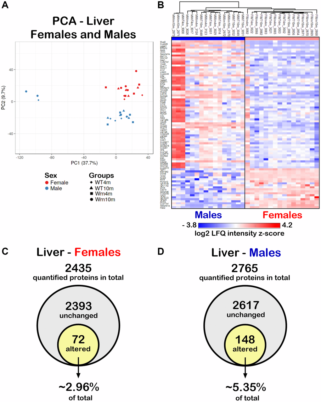 To determine whether the liver proteome profiles differed between WrnΔhel/Δhel and wild type mice, quantitative proteomic profiling with label-free LC-MS/MS was performed. Four females and four males of each cohort constituting biological replicates were used for the label-free quantification analyses. A total of 3277 proteins in the liver samples were identified (Supplementary Table 2). Principal component analysis (PCA) using the LFQ normalized and imputed data (Supplementary Table 2) were performed. As indicated in Figure 4A, a clear distinction between the liver proteome profiles of females and males was perceptible. To generate a list of proteins that showed significant differences between the females and males, we calculated the mean of the LFQ intensities for each group, the fold change, the p-value, and the Z-score for comparison (Supplementary Table 3). The heatmap in Figure 4B shows 84 proteins with significant differences between female and male groups with a p-value < 0.05 and a |Z-score| >1.96 and this regardless of the age and genotype of mice. Out of these 84 proteins, 64 and 20 proteins were down and up regulated in the liver of females compared to males, respectively. Enrichments of specific biological processes that were altered in females compared to males were evaluated using the Database for Annotation, Visualization and Integration Discovery (DAVID) tool [26]. The analysis indicated that proteins involved in the xenobiotic metabolic process, exogenous drug catabolic process, organic acid metabolic process, steroid metabolic process, lipid metabolic process, arachidonic acid metabolic process, and cellular response to glucocorticoid stimulus were down regulated in females compared to males (Table 1). The 20 up regulated proteins in the liver of females compared to the liver of males were not associated significantly with a biological process after Bonferroni adjustment.