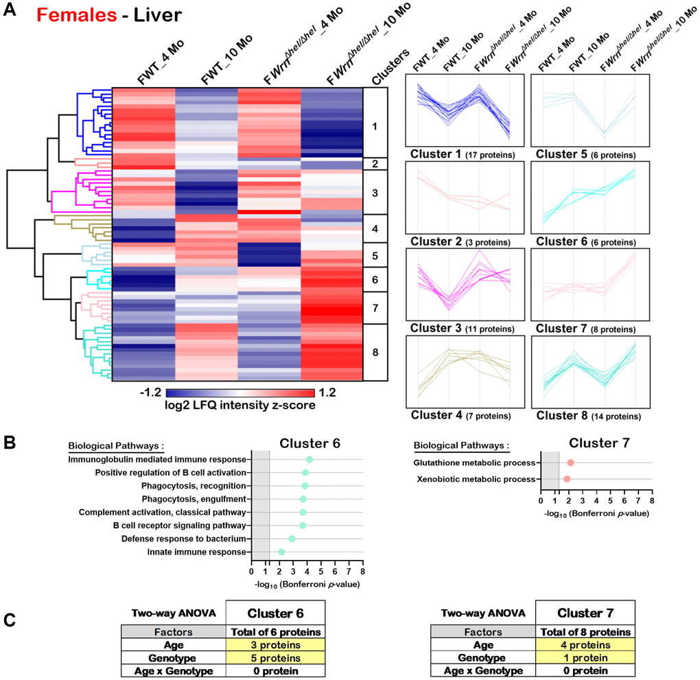 Hierarchical clustering of the mean of the label-free quantification (LFQ) intensities for the proteins that exhibited a two-fold change between the different groups of females or males with a p-value < 0.05 and a |Z-score| >1.96 was performed to gain insights into the biological processes that were altered in WrnΔhel/Δhel mice. As shown in Figure 5A, the hierarchical clustering analysis generated by the Perseus software [27] identified eight protein clusters in the liver of females that showed distinct trend profiles with respect to age and/or genotype. Two of these clusters (Cluster 6 and Cluster 7) showed enrichments of specific biological processes based on the DAVID bioinformatics tool [26] with a significant Bonferroni p-value. Cluster 6 contained six proteins, four of which are involved in different aspects of the immune system response (Figure 5B). The trend plot of Cluster 6 indicated an increase of their LFQ intensities in WrnΔhel/Δhel females at ten months of age compared to all the other female groups (Figure 5A). Interestingly, the LFQ intensities of the WrnΔhel/Δhel females at four months of age was similar to the LFQ intensities of the wild type females at ten months of age (Figure 5A). Based on a two-way ANOVA analysis, three proteins from this cluster were significantly different between four- and ten-months females and five proteins were significantly different between wild type and WrnΔhel/Δhel females (Figure 5C and Supplementary Table 6). Although three proteins in Cluster 6 were affected by age and genotype, there was no significant interaction between these variables in the liver of females. Cluster 7 contained eight proteins. DAVID analysis indicated an enrichment of glutathione and xenobiotic metabolic processes for this Cluster (Figure 5B). The trend plot of Cluster 7 showed an increase of the LFQ intensities in WrnΔhel/Δhel females at ten months of age compared to the other female groups (Figure 5A). Based on a two-way ANOVA analysis, four proteins from this cluster were significantly different between four- and ten-months females and one protein was significantly different between wild type and WrnΔhel/Δhel females (Figure 5C and Supplementary Table 6). There was no significant interaction between the age and the genotype in the liver of females for these proteins.
