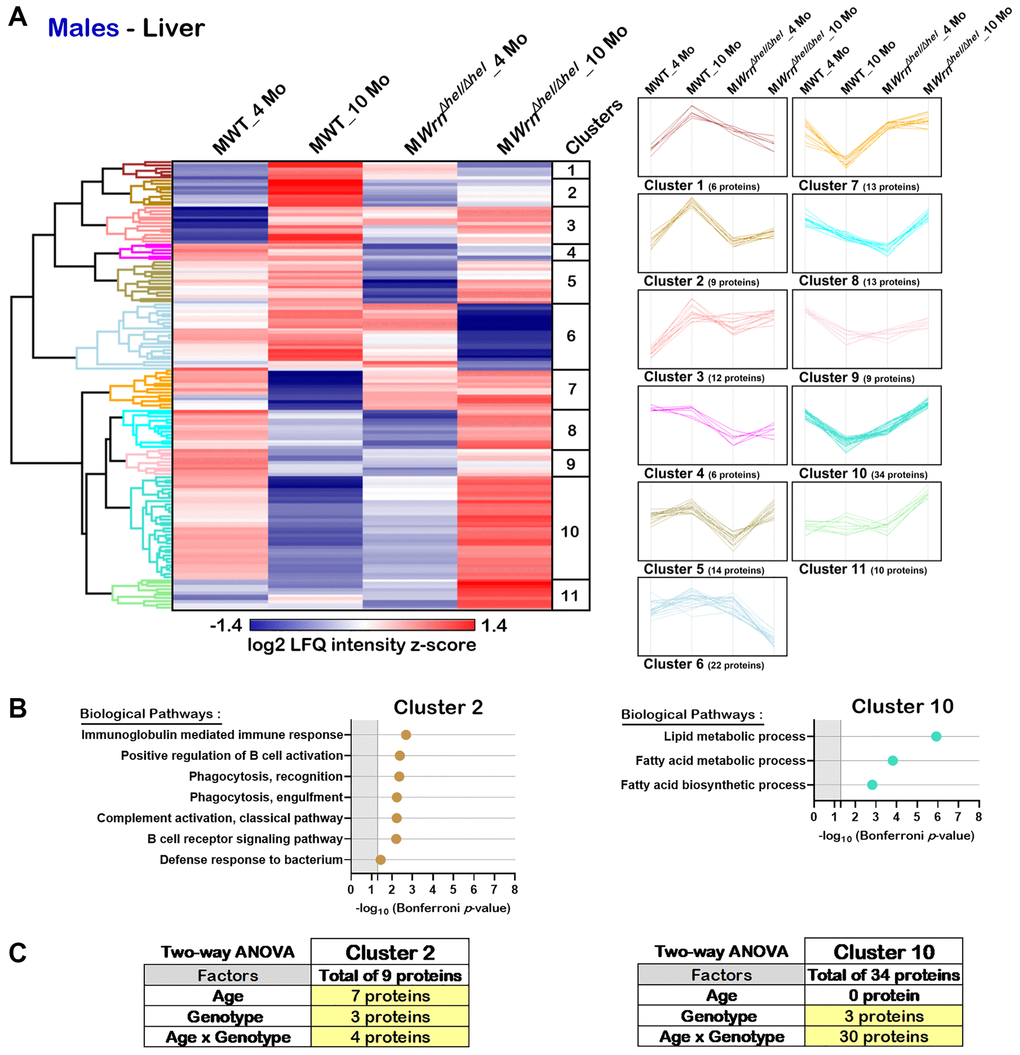 Hierarchical clustering analysis identified eleven protein clusters in the liver of males (Figure 6A). DAVID bioinformatics analysis identified two clusters of proteins (Cluster 2 and Cluster 10) associated with enrichments of specific biological processes with a significant Bonferroni p-value. Several proteins from Cluster 2 were involved in different aspects of the immune system response (Figure 6B). Various proteins from Cluster 10 were associated with different aspects of lipid or fatty acid metabolic processes (Figure 6B). Cluster 2 was composed of nine proteins with the highest LFQ intensities observed in ten months old wild type males. Based on two-way ANOVA analysis, seven proteins were significantly different between four- and ten-months males and three proteins were significantly different between wild type and WrnΔhel/Δhel males (Figure 6C and Supplementary Table 6). There was a significant interaction between age and the WrnΔhel/Δhel genotype for four proteins in Cluster 2. The four proteins composing the biological processes of Cluster 2 were mainly affected by an interaction between age and genotype based on two-way ANOVA analysis (Figure 6C and Supplementary Table 6). Cluster 10 was composed of 34 proteins. The LFQ intensities of all these proteins were the highest in the 10 months old WrnΔhel/Δhel male group (Figure 6A). Interestingly, the LFQ intensities of these proteins tended to decrease with age in the wild type males but increased with age in the WrnΔhel/Δhel males (Figure 6A). Based on two-way ANOVA analysis, there was a significant interaction between the age and the WrnΔhel/Δhel genotype for 30 of the 34 proteins in Cluster 10 (Figure 6C and Supplementary Table 6). Thus, the proteins that were involved in lipid and fatty acid metabolic processes showed a significant interaction between age and the WrnΔhel/Δhel genotype.