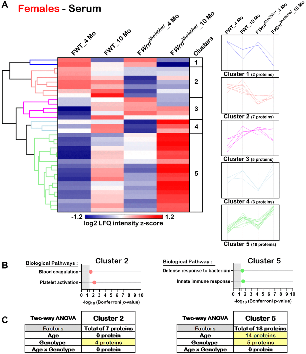 Hierarchical clustering of the mean of the label-free quantification (LFQ) intensities for the proteins that exhibited a two-fold change between the different groups of females or males with a p-value < 0.05 and a |Z-score| >1.96 was performed to gain insights into the biological processes that were altered in the serum of WrnΔhel/Δhel mice. As shown in Figure 8A, the hierarchical clustering analysis identified five protein clusters in the serum of females. Two clusters (Cluster 2 and Cluster 5) showed enrichments of specific biological processes based on gene ontology analysis. Seven proteins were part of Cluster 2 and several of these proteins were involved in platelet activation and blood coagulation processes (Figure 8B). Proteins from these biological processes were mainly affected by the genotype as their abundance was lower in the serum of WrnΔhel/Δhel females compared to wild type females (Figure 8A). Based on a two-way ANOVA analysis, four proteins from Cluster 2 were significantly different between wild type and WrnΔhel/Δhel females and included proteins associated with blood coagulation and platelet activation (Figure 8C and Supplementary Table 11). Eighteen proteins were part of Cluster 5 and several of these proteins were involved in the innate immune response and/or the bacterial defense response (Figure 8B and Supplementary Table 11). Based on a two-way ANOVA analysis, 14 proteins of Cluster 5 were significantly different between four- and ten-months females and five proteins were significantly different between wild type and WrnΔhel/Δhel females (Figure 8C and Supplementary Table 11). Proteins of the immune response process in Cluster 5 were mainly affected by age.