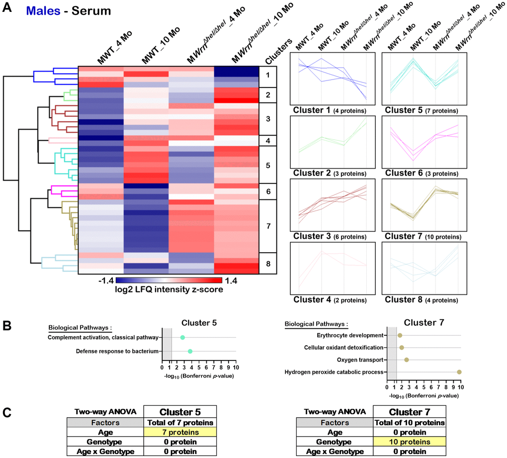 Hierarchical clustering analysis identified eight protein clusters in the serum of males (Figure 9A). DAVID bioinformatics analysis identified two clusters of proteins associated with enrichments of specific biological processes (Cluster 5 and Cluster 7). Several proteins from Cluster 5 were involved in the classical complement activation pathway and defense response to bacterium (Figure 9B). Various proteins from Cluster 7 were involved in erythrocyte development, cellular antioxidant detoxification, oxygen transport, and the hydrogen peroxide catalytic process (Figure 9B). Cluster 5 was composed of seven proteins. Based on two-way ANOVA analysis, all these proteins were significantly different between four- and ten-months males (Figure 9C and Supplementary Table 11) and thus the biological processes in Cluster 5 were affected by age. Cluster 7 was composed of ten proteins. Based on two-way ANOVA analysis, all these ten proteins were significantly different between wild type and WrnΔhel/Δhel males (Figure 9C and Supplementary Table 11). As such, all the proteins associated with the biological processes identified in Cluster 7 were affected by the genotype as their abundance was higher in all the WrnΔhel/Δhel males compared to wild type males regardless of their age (Figure 9B).