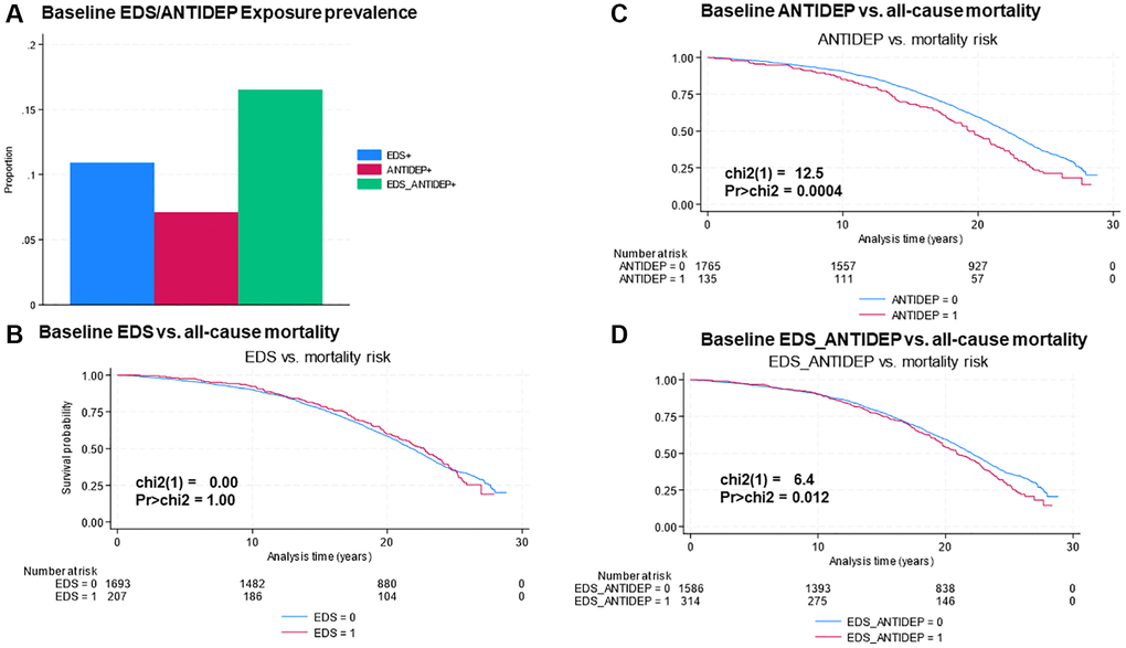 First, summary statistics included mean ± standard errors for continuous variables and frequencies with percentages for categorical variables. Kaplan-Meier estimates for survival probabilities were plotted against the 3 main baseline exposures of interest (baseline EDS, antidepressant use (ANTIDEP) and the combined baseline exposure EDS_ANTIDEP) across follow-up time (years) from baseline age to exit through censoring or event. Log-rank tests were conducted and other survival time descriptives (years) are reported along with exposure prevalence estimates.