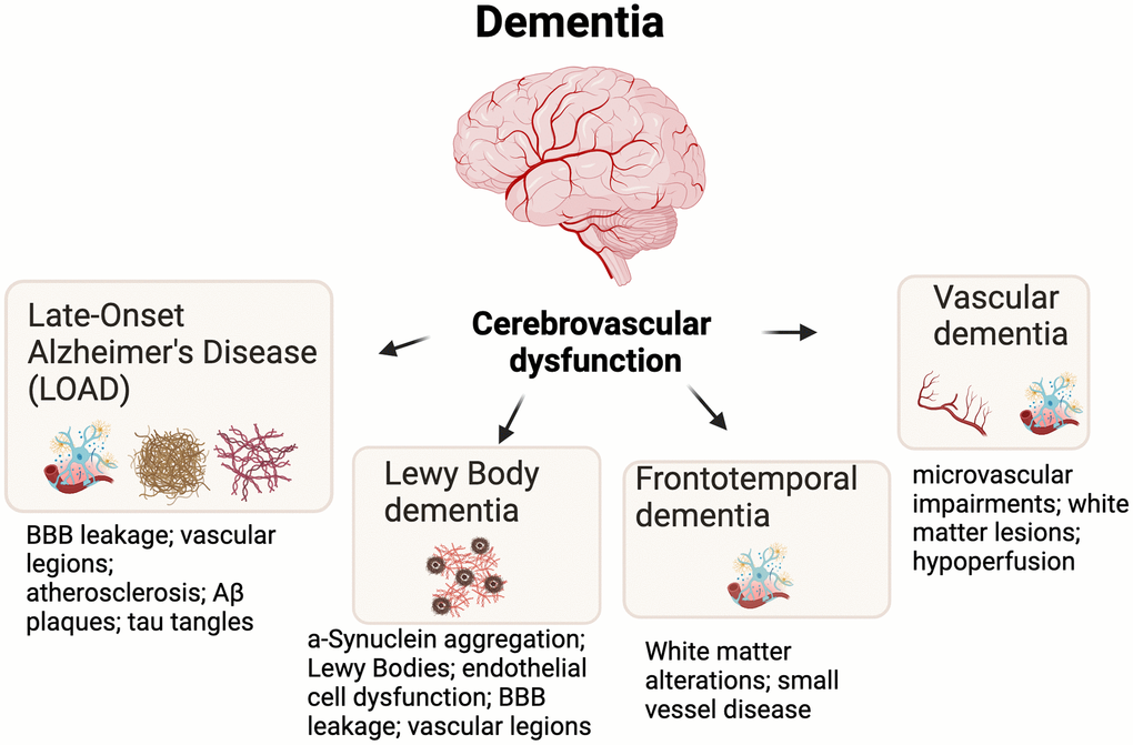 The most common type of dementia is Late-Onset Alzheimer’s Disease (LOAD) which accounts for ~50-60% of all dementia cases [14]. Neuropathologies that are associated with Alzheimer’s disease (e.g., Aβ plaques and tau neurofibrillary tangles) are closely linked to cerebrovascular dysfunction by inducing vascular lesions, blood-brain barrier (BBB) disruption, and atherosclerosis [15]. Pathological Aβ and hyperphosphorylated tau are also linked to excessive oxidative stress, which may further drive the cycle of neuronal dysfunction and cognitive impairment [16, 17].