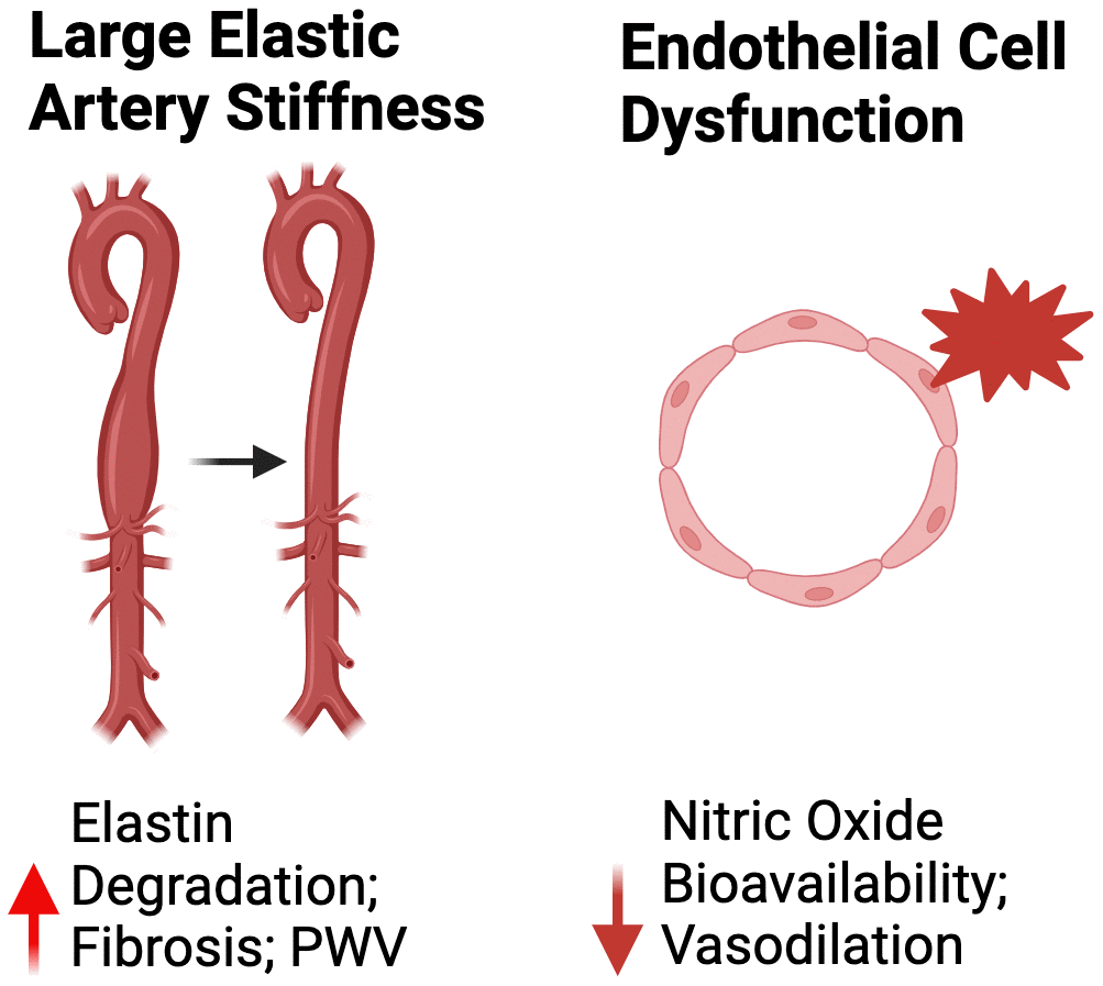 Peripheral vascular dysfunction, as defined above (e.g., large elastic artery stiffening and endothelial dysfunction), occurs with advancing age [7]. The large elastic arteries expand and recoil with each bolus of blood ejected from the left ventricle during systole. The process of expanding and recoiling allow for dampening of the oscillatory pulse of blood that is ejected into the arterial system and aids in the outward flow of blood into the peripheral circulation and helps maintain perfusion of the heart during diastole [34]. The pulsatility-dampening effect of large elastic arteries is critical for reducing the transmission of harmful high pulsatile pressures to low-impedance, high flow sensitive organs, such as the brain [34].