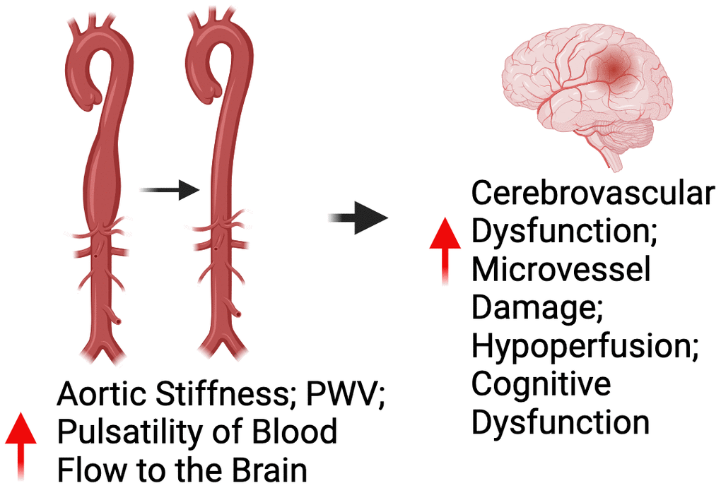 As previously stated, large elastic artery stiffening can increase the pulsatility of blood flow to the brain. Considering the brain is a high-flow organ with low resistance vascular beds, the increase in pulsatility can damage cerebral microvessels and directly promote cerebrovascular dysfunction leading to a state of hypoperfusion of oxygen to the brain and ultimately cognitive impairment [42]. Indeed, a myriad of large cohort studies (n = 205-3207) have consistently demonstrated that large elastic artery stiffening, as measured by aortic PWV, is inversely associated with cognitive function [32, 43–45]. In addition to aortic PWV, aortic stiffness as assessed by carotid artery stiffening, is inversely related to cognitive function in ML/O adults [46–49]. Importantly, large elastic artery stiffening has emerged as an independent predictor of future cognitive impairment in ML/O adults [50].