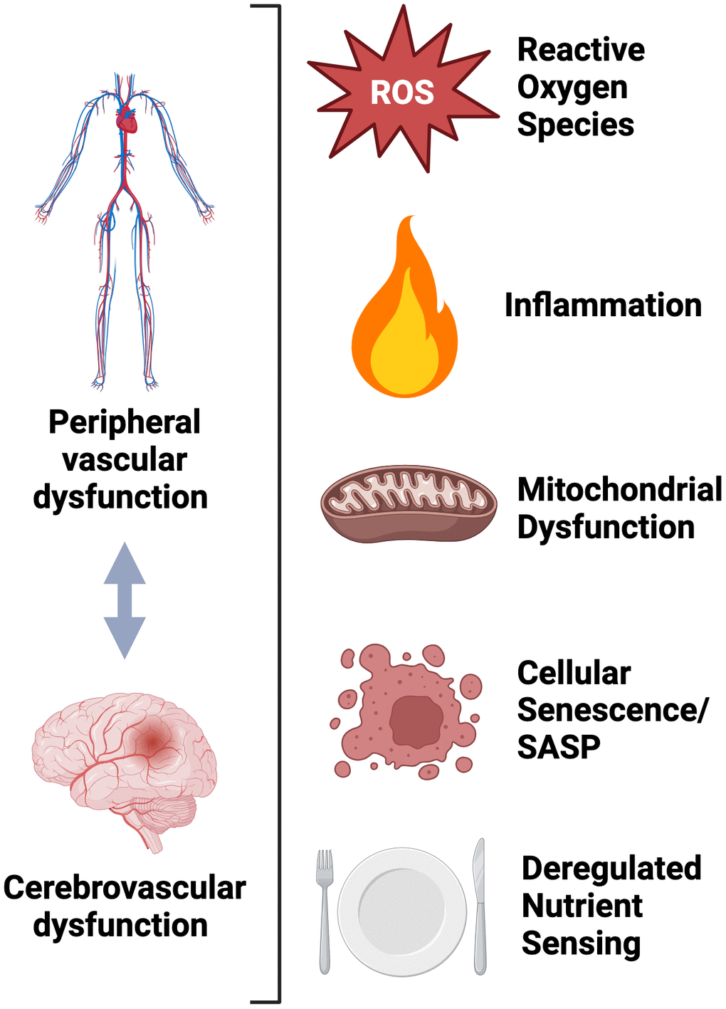 Although the physiological relation between peripheral vascular dysfunction and brain aging has been well documented, the shared cellular/molecular mechanisms mediating both processes have not been thoroughly reviewed concomitantly. As described throughout this review, excessive production of ROS-related oxidative stress underlies both peripheral vascular dysfunction and brain aging.