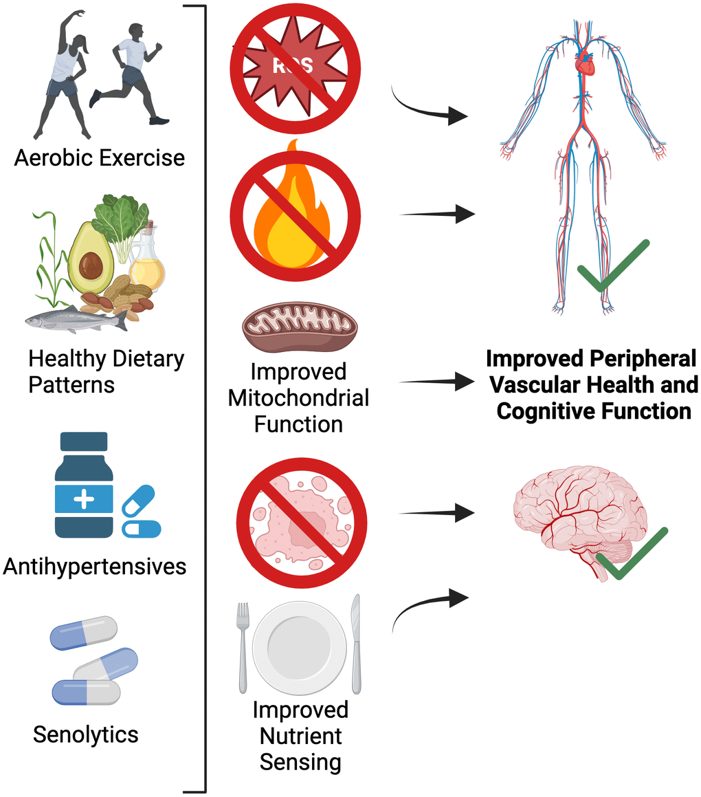 Treatments (described below in more detail) aimed at reducing peripheral vascular risk factors, such as aerobic exercise and certain dietary patterns, have been shown to attenuate dementia incidence and progression [13]. These mechanisms largely involve lower ROS-related oxidative stress and inflammation, improved mitochondrial function, and reduced burden of cellular senescence. Emerging evidence suggests that these mechanisms also contribute to cerebrovascular dysfunction, suggesting that measurements of peripheral vessel function are good indicators of brain health/function [27].