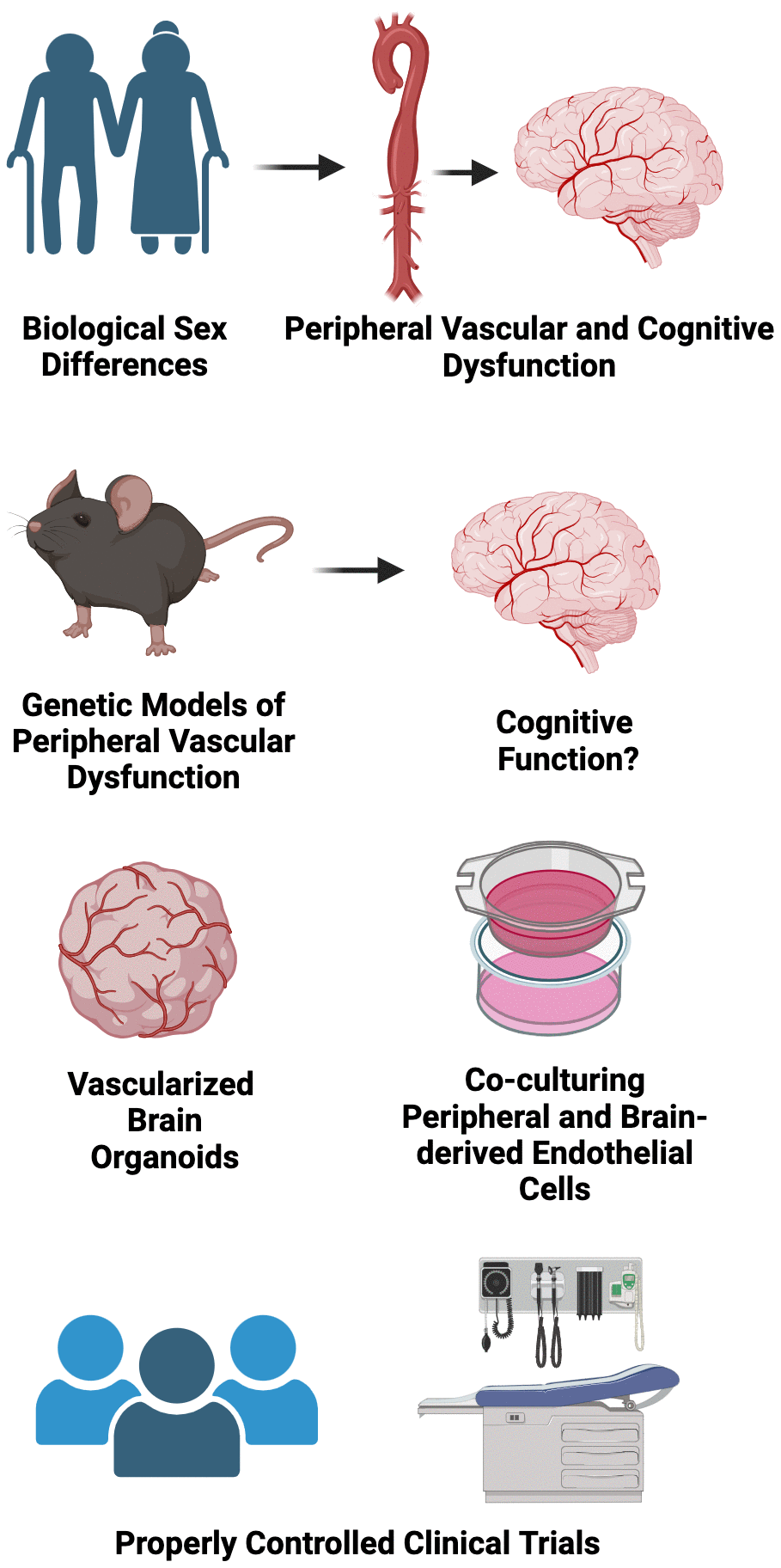 Biological sex is a non-modifiable risk factor for peripheral vascular dysfunction and various types of dementia. For example, ML/O adult estrogen deficient postmenopausal women are at greater risk of developing CVD [159] and vascular dementia and LOAD [160, 161] relative to age-matched men. The precise mechanisms underpinnings these phenotypes are not completely clear but may in part be explained the progressive loss of peripheral vascular function over the menopausal transition [162, 163], as a similar loss in gonadal function does not consistently occur in age-matched men. Moreover, the greater prevalence of dementia in women could be explained by the fact that women survive to older ages when compared to men [164], or due to the potential protective effect of estrogen on brain function, as physiological levels of estrogen mitigate excessive oxidative stress [165, 166]. Thus, there is a clear need to more comprehensively understand how biological sex and gonadal status influence the relation between peripheral vascular function and cognitive health with aging and the cellular/molecular mechanisms underpinning these differences.