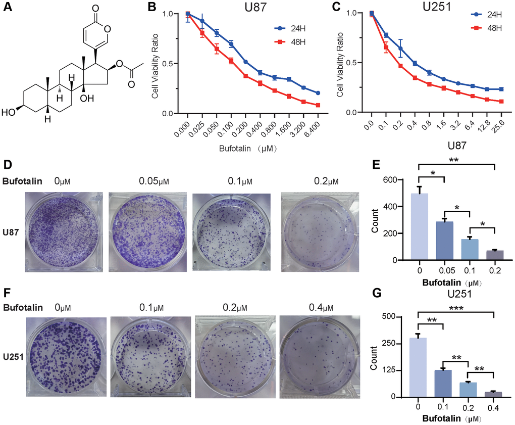 The molecular structure of bufotalin was shown in Figure 1A. U87 and U251 cells were treated with different concentrations of bufotalin. According to CCK8, we found that bufotalin significantly inhibited the viability of U87 and U251 cells in a dose and time-dependent manner with 113.2 nM (U87) and 199.5 nM (U251) at 24 h and with 102.3 nM (U87) and 134 nM (U251) at 48 h (Figure 1B, 1C). The colony formation assay was performed and the results showed that bufotalin had a significant dose-dependent effect on reducing the number of colonies formed by U87 and U251 cells (Figure 1D–1G).