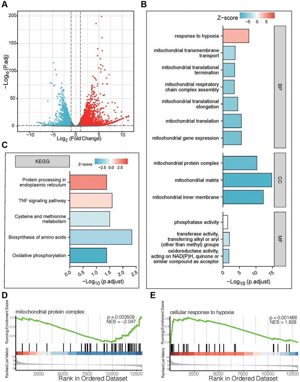 In order to further explore the potential mechanism of bufotalin on GBM cells, the U87 cells were treated with DMSO as a control group and bufotalin for 24 h, and then transcriptomic sequencing was conducted. First, we performed differentially expressed gene analysis and generated a volcano plot (Figure 2A). And the number of upregulated genes was 2942, while the number of downregulated genes was 2353 in bufotalin group compared with control group. Next, we performed GO analysis and the results showed that the mitochondrial-related signaling pathway was significantly downregulated in the bufotalin group, suggesting its potential disruption of mitochondrial function (Figure 2B). Furthermore, we conducted KEGG analysis and found that amino acid synthesis and oxidative phosphorylation were downregulated in the bufotalin group (Figure 2C). Besides, upregulated and downregulated genes were used to perform GSEA and the results showed that mitochondrial protein complex was downregulated and cellular response to hypoxia was upregulated (Figure 2D, 2E). Overall, the results of RNA-seq demonstrated that bufotalin could lead to the dysfunction of mitochondria.