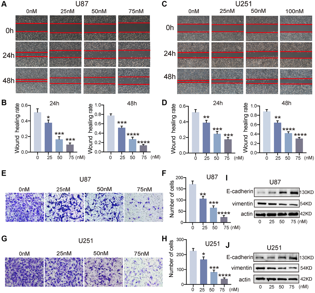 Building upon the aforementioned outcomes, we proceeded to explore the impact of bufotalin on the invasive and migratory capacities of GBM. First, we used wound-healing assay to examine the effect of bufotalin on the migration of GBM cells. The findings indicated that the migration of U87 and U251 cells was significantly inhibited by Bufotalin in a dose-dependent manner. Besides, the inhibitory effect of bufotalin on GBM cells was significantly stronger at 48 hours than at 24 hours (Figure 3A–3D). Consistently, the results of Transwell assays showed that bufotalin dose-dependently decreased the invasion of GBM cells (Figure 3E–3H). EMT has emerged as a crucial regulator of invasion, displaying a strong correlation with the malignancy of GBM [18]. To further investigate the effect of bufotalin on EMT, we performed western blotting to detect the expression of EMT-related genes, including E-cadherin and vimentin in GBM. The findings exhibited a dose-dependent escalation in E-cadherin expression subsequent to the administration of Bufotalin, coupled with a concomitant reduction in vimentin expression (Figure 3I, 3J). These findings suggested that Bufotalin attenuated the EMT in both U87 and U251 cell lines.