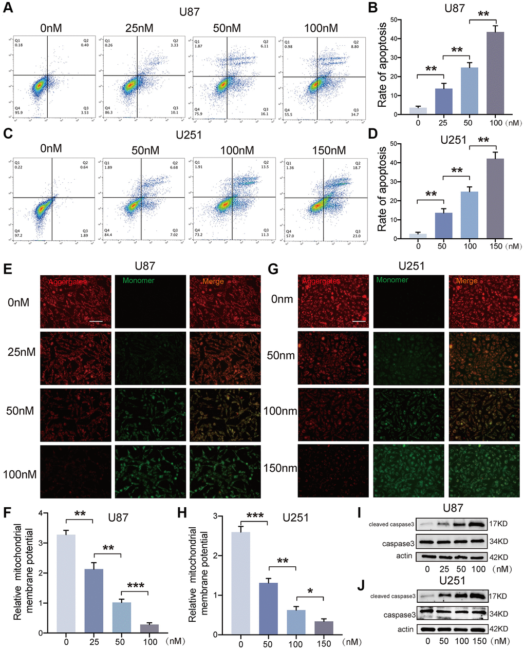 To detect the apoptosis of GBM cells, the cells which were treated with bufotalin after 24 h were stained with PE and 7AAD. Due to the different IC50 values of bufotalin on U87 and U251 cells, we treated these two cell lines with different concentrations of bufotalin. And the data showed that the rate of cell apoptosis significantly increased with the increase of bufotalin concentration (Figure 4A–4D). Besides, mitochondrial outer membrane permeabilization is an important step in the process of mitochondrial apoptosis induction, leading to the ultimate death of the cell [19]. Thus, we also performed JC-1 assays. Consistently, the results showed that bufotalin treatment decreased the ratio of red/green fluorescence intensity in both U87 and U251 cells (Figure 4E–4H). Caspase-3 is a commonly activated apoptotic protease, facilitating the selective cleavage of numerous pivotal cellular proteins, and mitochondrial dysfunction can activate caspase to start the process of cell death [20].