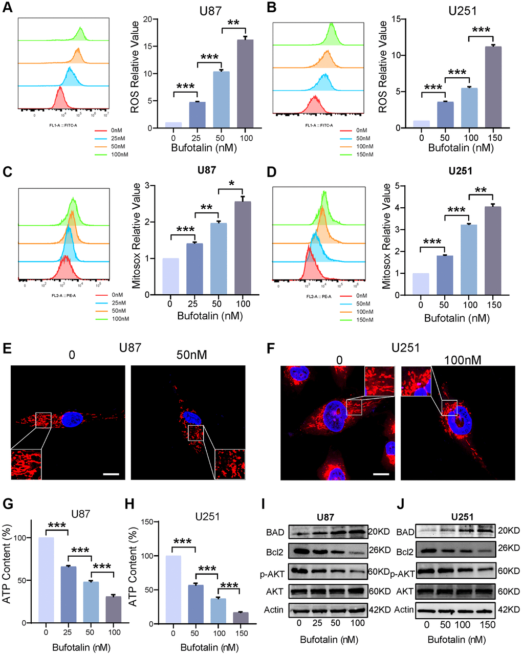 We used flow cytometry to detect total ROS and found that the accumulation of intracellular ROS significantly increased with increasing bufotalin concentration (Figure 5A, 5B). Excessive accumulation of ROS can cause mitochondrial dysfunction [21]. Consistently, our study found that mitochondrial ROS significantly increased with a dose-dependent manner of bufotalin (Figure 5C, 5D). We also found that the mitochondria of the bufotalin-treated group had significant abnormalities compared to the control group by using confocal microscopy to observe the morphology of the mitochondria (Figure 5E, 5F). Furthermore, we detected a decrease in ATP levels with increasing bufotalin concentration (Figure 5G, 5H). All these results indicated that bufotalin disrupts mitochondrial function in GBM cells. Subsequently, we assessed the expression levels of Bcl2 and its associated proteins, pivotal in the regulation of mitochondrial function [22]. We found that bufotalin upregulated the expression level of BAD and downregulated the expression level of Bcl2. Besides, our data showed that the phosphorylation of AKT was downregulated by bufotalin (Figure 5I, 5J). All these results demonstrated that bufotalin promoted mitochondrial dysfunction by increasing ROS and decreasing the phosphorylation of AKT.