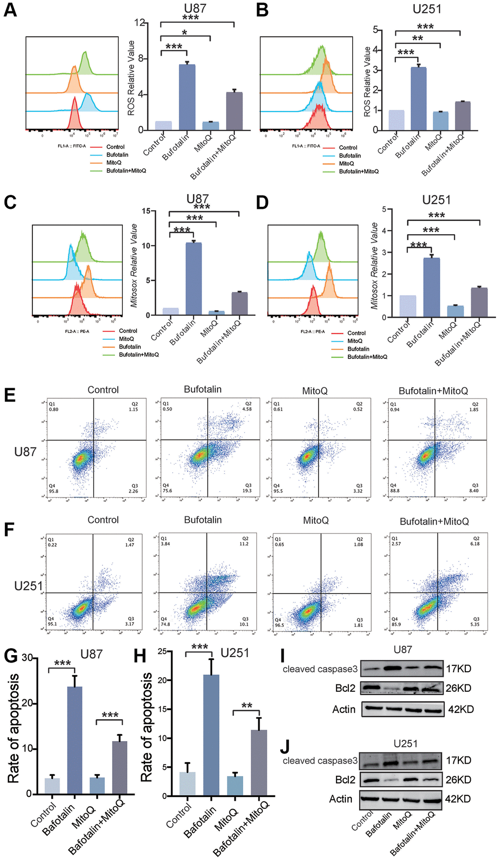 Next, we used Mitoquinone (MitoQ) which is a mitochondria-targeted antioxidant [23] to rescue the effect of bufotalin in GBM cells. Furthermore, the results indicated a notable suppression by MitoQ of the increase in intracellular ROS induced by bufotalin (Figure 6A, 6B). Additionally, the elevation of mitochondrial ROS caused by bufotalin could be significantly inhibited by MitoQ (Figure 6C, 6D). Consistently, our study found that MitoQ could significantly reduce bufotalin-induced cell apoptosis (Figure 6E–6H). In addition, we observed that MitoQ reduces the changes in protein levels of caspase3 and Bcl2 induced by bufotalin (Figure 6I, 6J). These results indicated that bufotalin inhibits EMT and promotes apoptosis through inducing mitochondrial dysfunction in GBM cells.