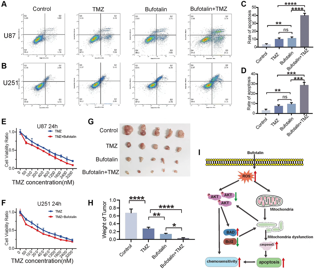 Both EMT and apoptosis play a crucial role in the sensitivity of GBM to TMZ chemotherapy. First, we performed flow cytometry and the results indicated that the apoptosis rate of GBM cells induced by the combination of TMZ and bufotalin was significantly higher than the apoptosis rate when either drug was used alone (Figure 7A–7D). Consistently, our results of CCK8 also revealed that the IC50 of TMZ when used in combination with bufotalin was significantly lower than the IC50 of TMZ alone (Figure 7E, 7F). Moreover, the combination treatment of TMZ and bufotalin resulted in a notably reduced weight of the isolated tumors compared to the groups subjected to individual treatments with TMZ or bufotalin (Figure 7G, 7H). Therefore, our results demonstrate that bufotalin can enhance the chemosensitivity of GBM to TMZ.