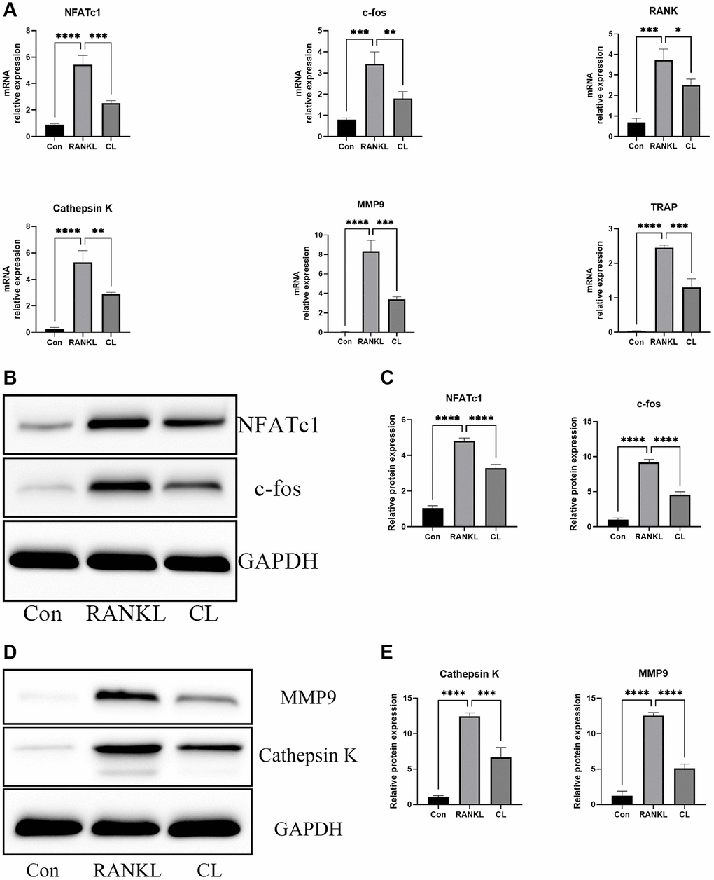 In order to further validate the results of CL inhibiting osteoclast differentiation and function at the transcription and translation level, a set of genes specifically involved in osteoclast differentiation (NFATc1, c-fos, RANK) and bone resorption (Cathepsin K, MMP9, and TRAP) were selected. In normalized data, it was found that CL markedly attenuated RANKL-stimulated expression of osteoclast-related genes (Figure 3A). At protein level, western blot analyses revealed the reduced proteins of NFATc1, c-fos, MMP9, and Cathepsin K in response to RANKL stimulation, which is consistent with the mRNA results (Figure 3B–3E).