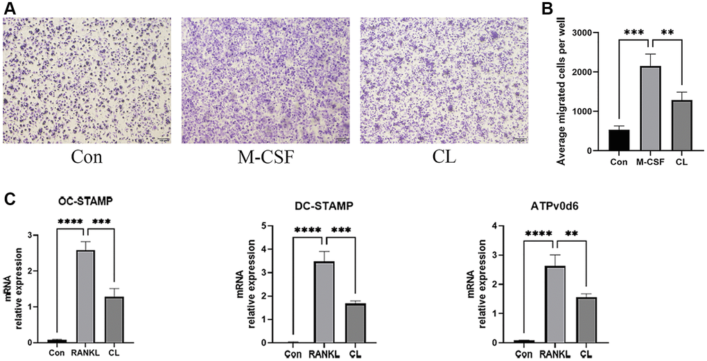 Following the previously described method [15], total number of 4 × 104 BMMs were seeded on the transwell system (24-well insert, Corning, Tewksbury, MA, USA). In transwell system, BMMs were incubated for 12 h in the presence of CL before exposing to the bone marrow macrophage complete media, which was added as chemotactic agent in the bottom chamber. The upper surface of the membrane was swabbed with a cotton swab to remove non-migratory cells, while the cells on the lower surface were fixed and stained with a 1% crystal violet solution. Quantification was performed by counting the number of stained cells.