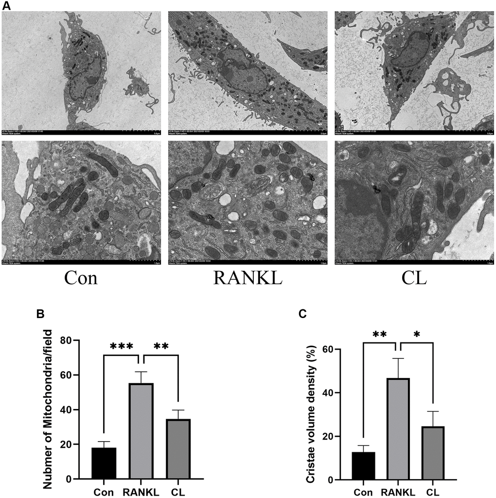 Following the previously described method [16], BMMs were cultured with osteoclast induction media. During osteoclast differentiation, DMSO or CL was supplemented in osteoclast induction media. On the third day, the cells were fixed with 2.5% glutaraldehyde, postfixed with 1% osmium tetroxide, dehydrated using an ethanol series, and finally embedded in resin. For TEM (HITACHI HT7700) observation of the embedded samples, the sections were cut to a thickness of 60 nm and stained with uranyl acetate and lead citrate. Mitochondria images from 15 cells were analyzed using ImageJ. Mitochondrial number was counted by Analyze Particles. Cristae density was estimated by the inner/outer mitochondrial membrane perimeter ratio.