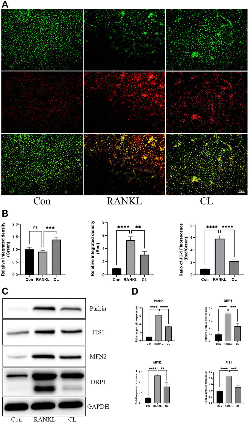 It has been described previously that osteoclast differentiation and activation are energy-intensive processes, resulting in an increase in mitochondrial number and activity within the cell [20]. During osteoclast development, the TEM revealed that the number of mitochondria increased, while CL reduced it. In addition, through observing the ultrastructure of mitochondria, we found that the density of cristae was richer in response to RANKL stimulation, and CL could attenuate that density (Figure 5). For measuring the activity of mitochondrial functions, we detected the mitochondrial membrane potential by JC-1 staining and found that CL significantly reduced the mitochondrial membrane potential during osteoclast differentiation (Figure 6A, 6B). According to previous study, the mitochondrial function and morphology were influenced by the fusion and fission of mitochondria [16]. Thus, we further investigated the protein level involved in mitochondrial fusion and fission. Our results indicate that RANKL stimulated the protein level of Parkin, DRP1, MFN2, and FIS1, whereas CL inhibited elevated protein levels (Figure 6C, 6D).