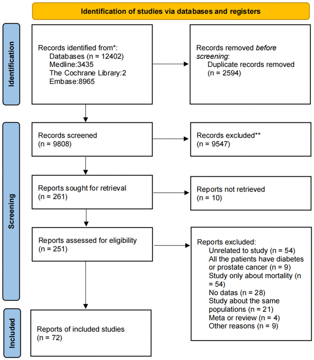 This study sought 261 reports for retrieval from the database or other sources. After using inclusion and exclusion tools, 189 articles were excluded, and 72 were included in this meta-analysis study. Of the 188 articles, 55 were found unrelative to our study after reading the full text. 54 articles only reported the mortality. 21 articles reported the same populations, 28 with no complete data, 4 were reviews of meta-analysis, 9 were studies for patients, and 9 for other reasons.