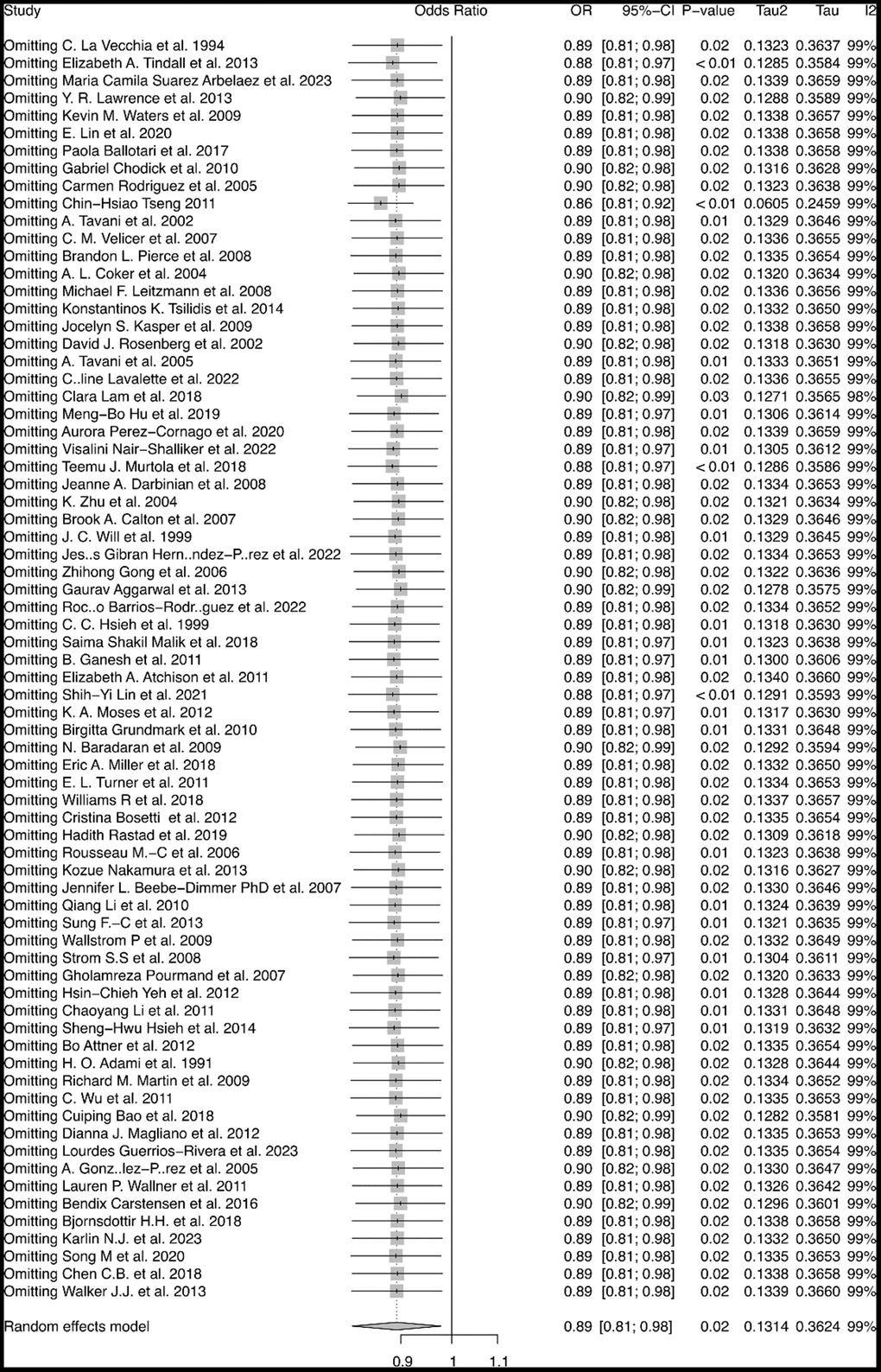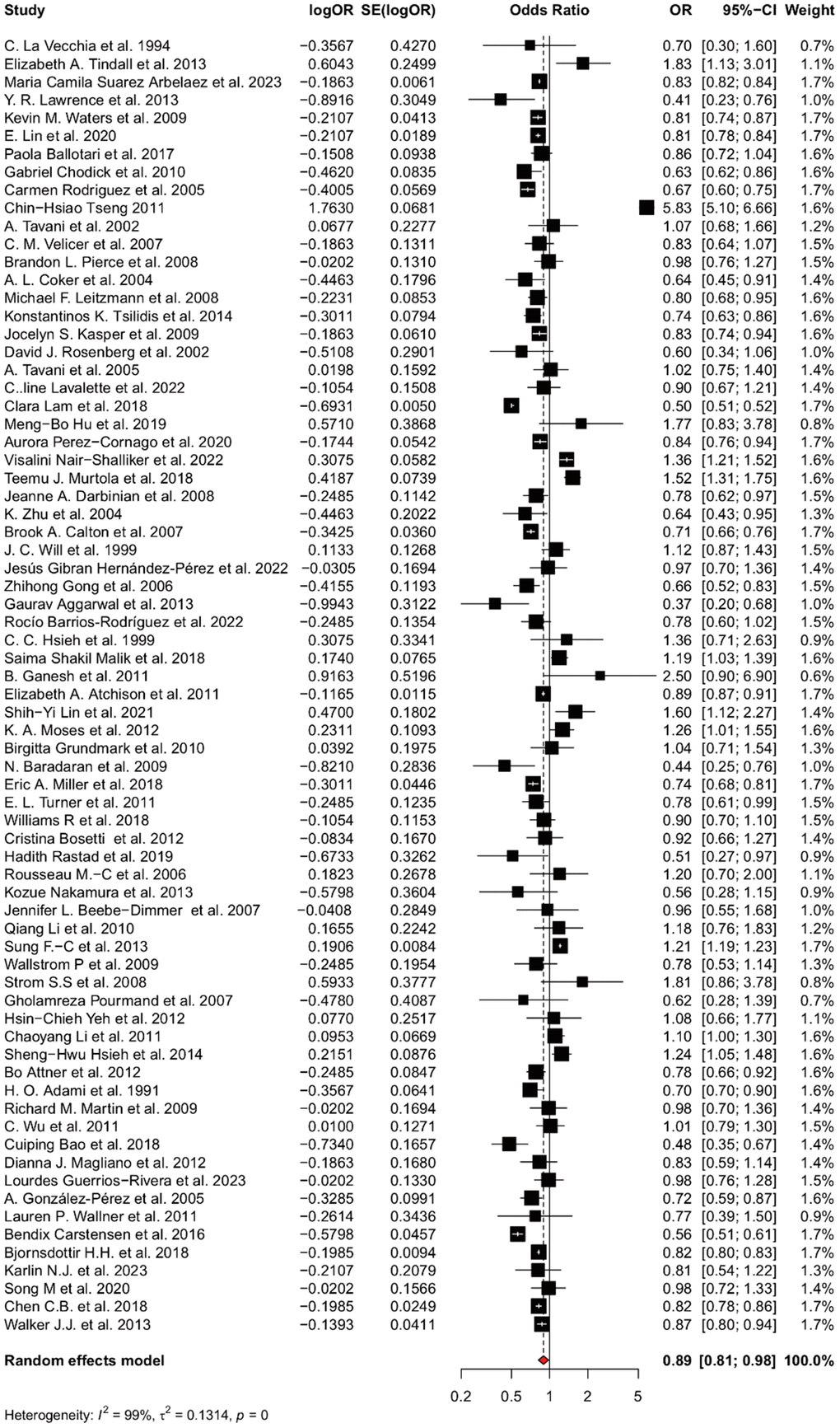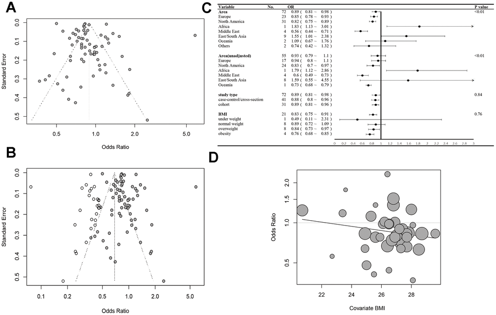 The characteristics of the 72 articles included in this study were shown in Supplementary Table 9. Among the studies, 35 were case-control studies, 31 were cohort studies, and 6 were cross-section studies. The match population in the case-control was varied, such as the patients in the same hospital and those in the same area. The total number of the population was 1,268,481. The regions of the studies were all over the world, such as Asia, North America, European, Africa, and Oceania. In the studies, most of the population was over 40 years old, and the average age was about 60. Most patients were identified from the national cancer registry or local medical records. 29 studies reported the influence of BMI, and 20 studies also reported the treatments of the patients.