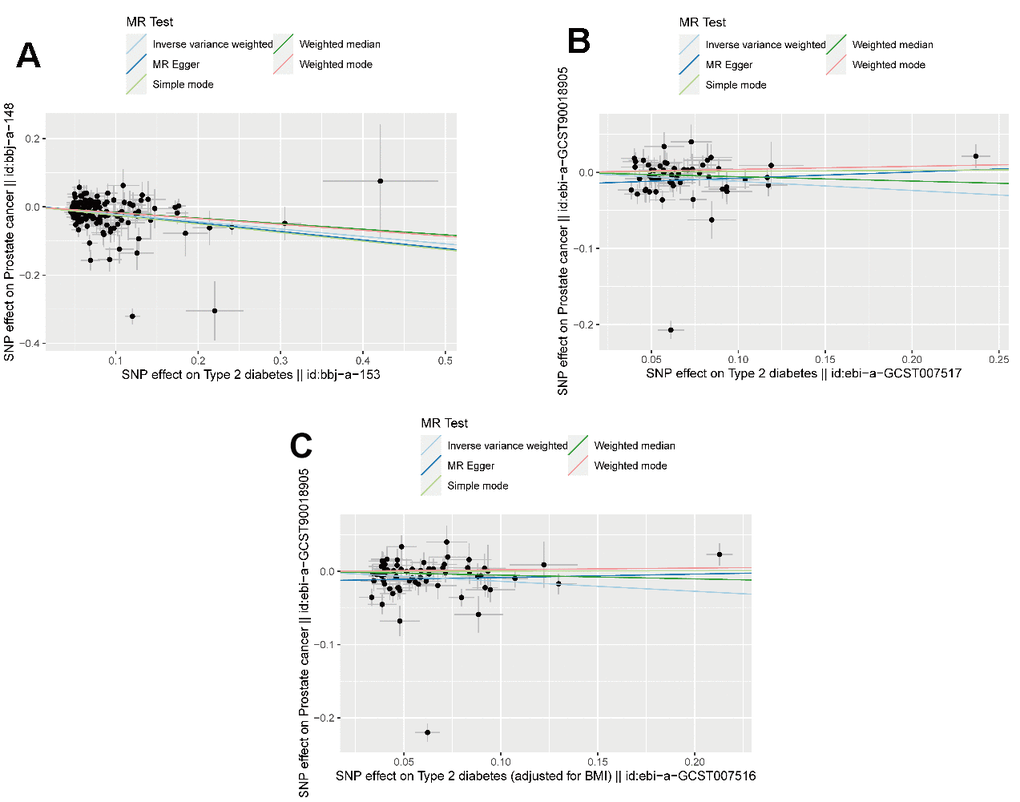 The data resources were obtained from MRC IEU OpenGWAS (https://gwas.mrcieu.ac.uk/; version: v7.5.12 - 2023-09-27), developed at the MRC Integrative Epidemiology Unit at the University of Bristol. The GWAS ID of the included study were: bbj-a-153 (Type 2 diabetes), bbj-a-148 (Prostate cancer), ebi-a-GCST007517 (Type 2 diabetes), ebi-a-GCST007516 (Type 2 diabetes (adjusted for BMI), ebi-a-GCST90018905 (Prostate cancer). The detailed information was shown in Supporting Information: Supplementary Table 2. All the p-values were two-tailed. The R software (version 4.2.1) with the ‘TwoSampleMR’ package was used for the analysis.