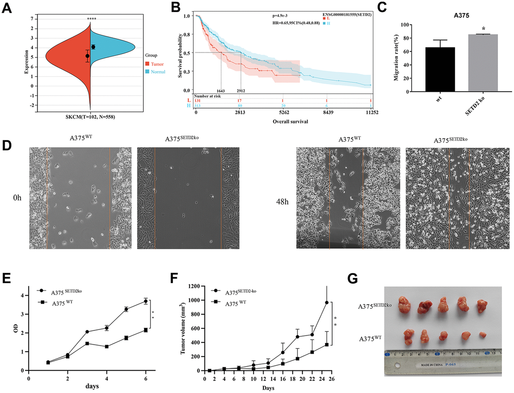 Basing on RNAseq data from skin melanoma (SKCM) samples from TCGA and GTEx (PANCAN, N=19131, G=60499) public database, we evaluated the SETD2 expression levels within cutaneous melanoma samples (Supplementary Table 1). Results found that SETD2 expression were significantly decreased in SKCM samples (Figure 1A) and samples with lower expression of SETD2 are more likely to have unfavorable overall survival outcome (Figure 1B and Supplementary Table 2). These results mean that lacking SETD2 expression may be related to tumorigenesis and progression in melanoma. Thereafter, we compared the wound healing ability of SETD2 knocked-out A375 (A375SETD2ko, Supplementary Figure 1) with its counterparts and found that the wound area of A375SETD2ko is significantly sallower than that of A375WT cells (Figure 1D and Supplementary Table 3), indicating a more aggressive bio-behavior of A375SETD2ko in migration. We also evaluated the cell viability via CCK8 assay, Figure 1E showed that the OD value of A375SETD2ko became higher than that of A375WT cells after culturing for 2 days, demonstrating a higher cell density of A375SETD2ko. To further verify the underlying impact of losing SETD2 expression, we used A375SETD2ko and A375WT, respectively, to construct nude mice tumor model and measured the tumor volume after cells were implanted for 26 days. From Figure 1F, 1G we can see that tumor volume grew in a time-dependent manner and A375SETD2ko grew faster than A375WT after implanted 6 days (Supplementary Table 4). These results illustrated that SETD2 plays a pivotal role in survival and tumor progression in melanoma, lacking SETD2 expression may lead to unfavorable survival outcome.