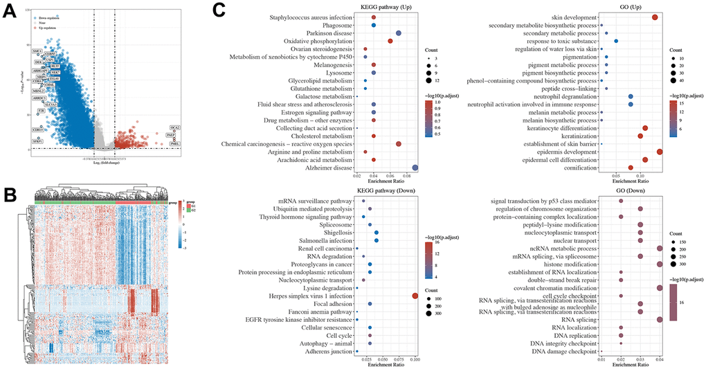 To further explore the underlying mechanisms of SETD2 downregulation in melanoma, we analyzed the significant different genes and evaluated the pathways in which SETD2 may involve using TCGA-SKCM samples. The differential genes were visualized in volcano plot, showing that compared to samples with higher SETD2 mRNA levels, 934 genes significantly up-regulated while 16 genes significantly down-regulated in samples with lower SETD2 mRNA levels (Figure 2A and Supplementary Table 5). The heatmap exhibits the top 50 differential genes with 1.5 log fold change (logFC, Figure 2B). Then we used genes with significance to enrich the SETD2 expression related pathways in KEGG and GO databases. Figure 2C shows that pathways linked to melanogenesis, skin and epidermal cells development pigment or melanin metabolic process were enriched, while pathways involving RNA metabolism and cell cycle were downregulated in SETD2 low expression group, demonstrated a possible role of lacking SETD2 expression on melanoma oncogenesis.