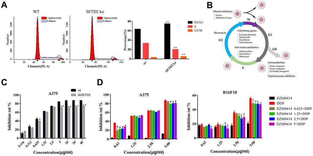 To further evaluate the efficacy of cell cycle nonspecific agents (CCNSA) on SETD2 downregulated cells, we tested the IC50 of Cisplatin (DDP) on A375SETD2ko cells compared with its wild-type counterparts. Our findings showed that the proliferation inhibition of DDP on Figure 3C and Supplementary Table 6 shows that the inhibition rate of DDP were remarkably decreased in A375SETD2ko cells. EZM0414, a SETD2 inhibitor that is under clinical study, were also used to analyze the impact of downregulation of SETD2 on DDP cytotoxicity. Figure 3D (left) shows that DDP alone can prevent A375 from growing in a dose-dependent manner. However, the inhibition rate decreased when A375 cells were co-cultured with DDP and EZM0414. Similar results were found in B16F10, a murine derived melanoma cell line in Figure 3D (right) and Supplementary Table 7. These results illustrate a potential role of lacking SETD2 in chemotherapy resistance in melanoma.