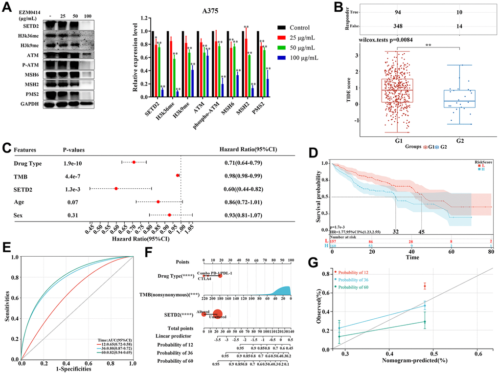 In order to further verify the biomarker value of SETD2 mutation in immunotherapy in cutaneous melanoma, we analyzed the data from Memorial Sloan Kettering Cancer Center (MSKCC), in which samples had undergone immunotherapy. Multi-factor analysis showed that drug type, TMB, and SETD2 mutation are protectors for immunotherapy-treated patients with significance (Figure 4C). KM survival analysis showed a remarkable reduced overall survival in patients with higher risk score and then area under the ROC curve (AUC) is of 0.8 and 0.5 for 3-year and 5-year survival, respectively (Figure 4C, 4D). To verify the predicting value of SETD2 alteration in immunotherapy response in melanoma, we created a nomogram based on 320 melanoma patients who underwent immunotherapy from MSKCC. Standard predictors for the risk of recurrence were drug types, age, TMB levels and SETD2 alteration. This nomogram could be used to predict the individual risk of systemic relapse and to develop a risk-adapted follow-up protocol (Figure 4F and Supplementary Table 9). Remarkably, the calibration curve demonstrated a strong concordance between the predicted and observed OS rates, indicating that the nomogram effectively predicted survival (Figure 4G).