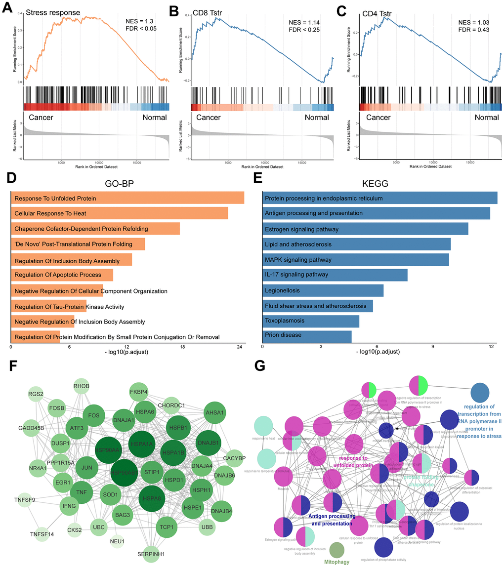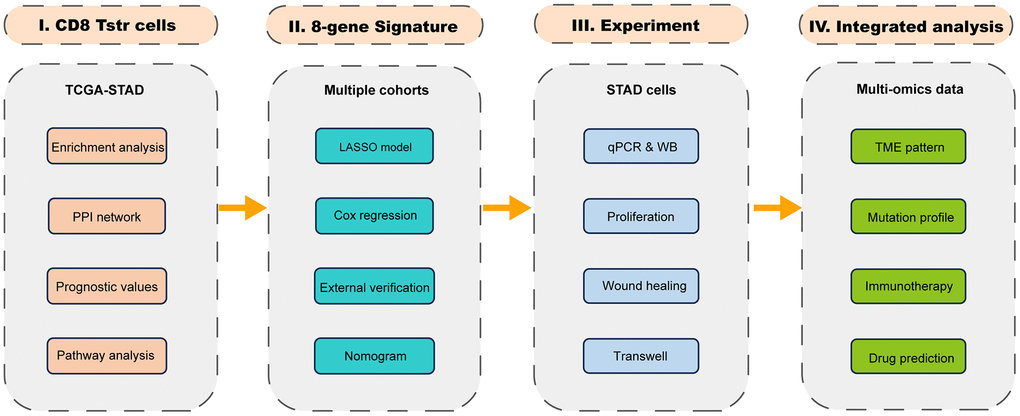 Due to the heterogeneous subpopulations and states of tumor-infiltrating T cells, some groups demonstrate anticancer efficacy in various immunotherapies, while others have the opposite effect. Recently, Yanshuo Chu and colleagues have identified a unique stress response state of T cells, termed TSTR, for the first time, which adds a new layer of complexity to our understanding of tumor immunology [5]. TSTR cells are low in abundance or undetectable in healthy tissues. TSTR cells are found in situ of the tumor microenvironment (TME) across cancers and mainly detectable in lymphocyte aggregates or potential tertiary lymphoid structures in cancer beds or surrounding cancer edges [5]. CD4+ and CD8+ TSTR cells have been shown to be clinically relevant in cancer treatment. Particularly in patients undergoing anti-PD1/PDL1 therapy, these cells are highly enriched in cancers that do not respond to treatment, both before and especially after therapy [5]. In recent years, the increasing knowledge of TME significance has shifted cancer research model from a cancer centricity to one that considers the TME as a whole [6]. The composition of the TME includes a variety of cellular and non-cellular components that collectively influence cancer initiation, progression, and prognosis. Tumor-infiltrating T cells, a key element within the TME, are not only used to stratify patients but are also considered a promising target for cancer treatment. [7, 8]. Analyzing the molecular characteristics and clinical relevance of TSTR cells in the TME will enhance our understanding of their role in gastric cancer (GC). Furthermore, developing a TSTR-based prognostic tool will be beneficial for categorizing patients into distinct risk groups. This stratification can guide critical decisions in clinical management, including determining the appropriateness of treatment options. This study aims to establish a prognostic gene signature associated with the TSTR phenotype within the TME of GC patients. Initially, we examined the status of CD4+ and CD8+ TSTR cells in GC, ultimately focusing on CD8+ TSTR cells for detailed multi-step bioinformatics analysis. We categorized GC patients from The Cancer Genome Atlas (TCGA) cohort into high and low TSTR groups based on the infiltration of CD8+ TSTR cells within the TME. These groups exhibited significantly different clinical prognoses and characteristics, underscoring the potential of TSTR-based stratification in understanding and treating gastric cancer. We then established and validated an eight-gene signature derived from the differentially expressed genes (DEGs) between the two TSTR groups. This gene signature effectively stratified GC patients into high and low risk categories, demonstrating reliability and robustness in prognostic predictions. We further validated the biological functions of a key signature gene, PDGFRL, through experimental studies in GC cells. Finally, we analyzed the differences in somatic mutation profiles, immune responses, and drug sensitivities between the high and low risk groups, highlighting their distinct clinical and molecular characteristics.