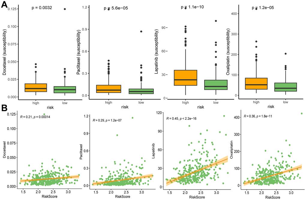 We performed oncoPredict analysis to evaluate the differences in sensitivity of anti-cancer drugs between the high and low risk groups. As a result, four commonly used clinical drugs (including docetaxel, paclitaxel, lapatinib and oxaliplatin) showed distinct sensitivity to different risk groups. All the drugs had better effects on patients in high-risk groups (Figure 10A), and the drug susceptibilities were significantly positively associated with risk scores (Figure 10B).