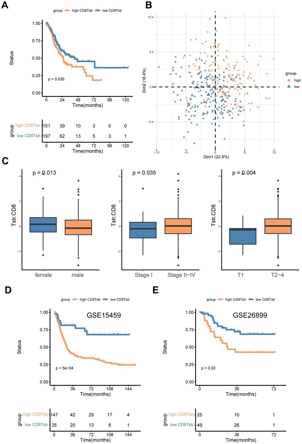 We employed the ssGSEA algorithm to assess the infiltration levels of CD8+ TSTR cells in each GC patient, classifying them into low and high CD8+ TSTR groups based on their infiltration scores. Our analysis revealed that patients in the low CD8+ TSTR group exhibited a significant survival advantage over those in the high CD8+ TSTR group within the TCGA-GC dataset (Figure 3A). A PCA plot further confirmed clear separation between the two groups (Figure 3B). We also evaluated the clinical relevance of this classification by gender (female/male), stage (I/II - IV), and T stage (1/2 - 4), finding significantly higher infiltration of CD8+ TSTR cells in females and significantly lower infiltration in early-stage (I and T stage 1) patients compared to their counterparts (Figure 3C). Additionally, the low CD8+ TSTR group demonstrated significantly longer overall survival (OS) than the high CD8+ TSTR group in two validation datasets from GEO-GC datasets (Figure 3D, 3E).