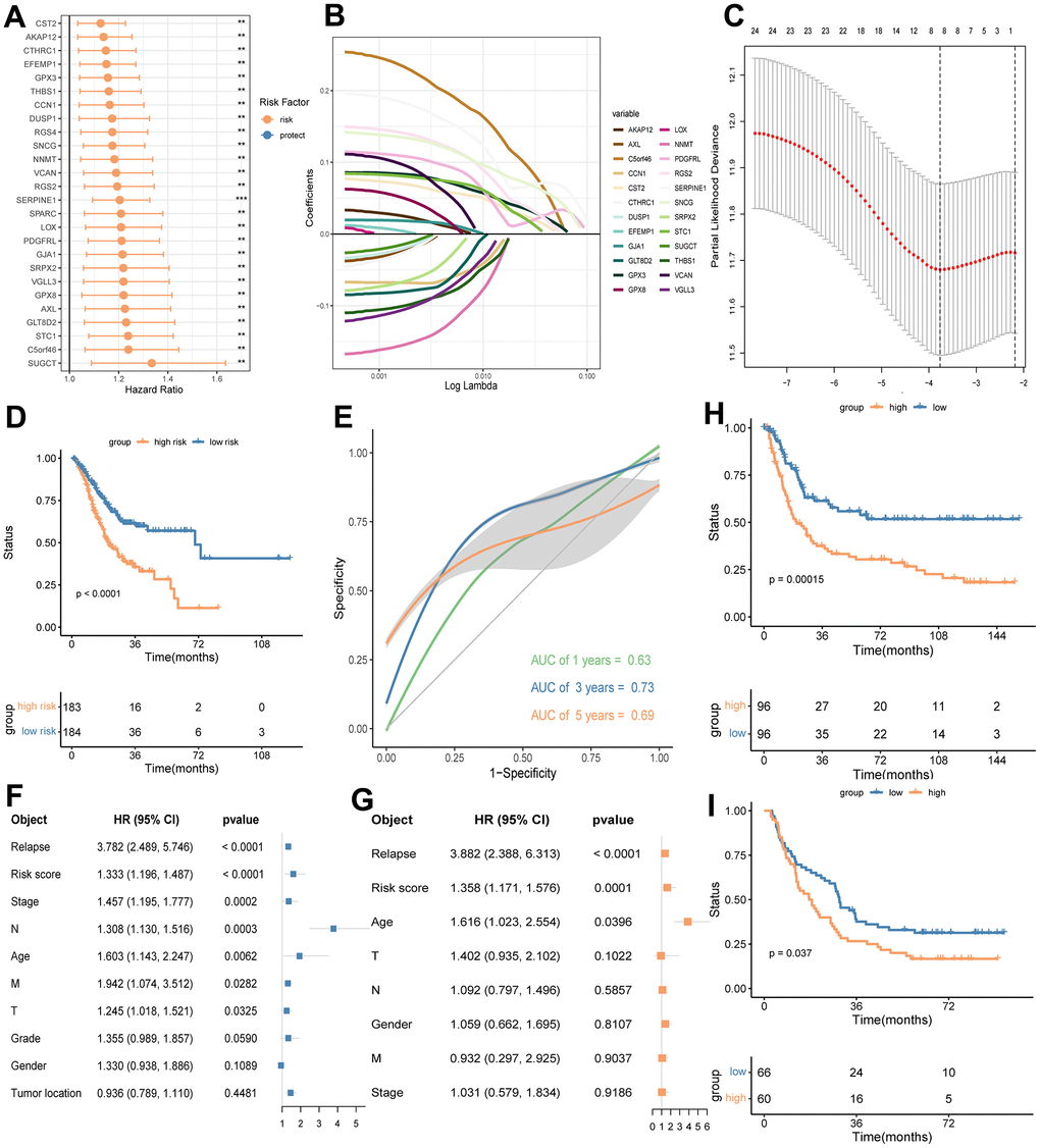 Based on the median, GC patients were dichotomized into high-risk and low-risk groups. Univariate cox and multivariable cox analyses were carried out to determine if the risk score or other clinical features (including age, gender, stage, recurrence, and other pathological parameters) were independent prognostic factors in GC patients. Subsequently, a nomogram signature was established by combining the risk score with other independent prognostic factors, and the corresponding receiver operating characteristic (ROC) and calibration curves for 1-, 3-, 5-year were plotted to confirm the predictive accuracy.