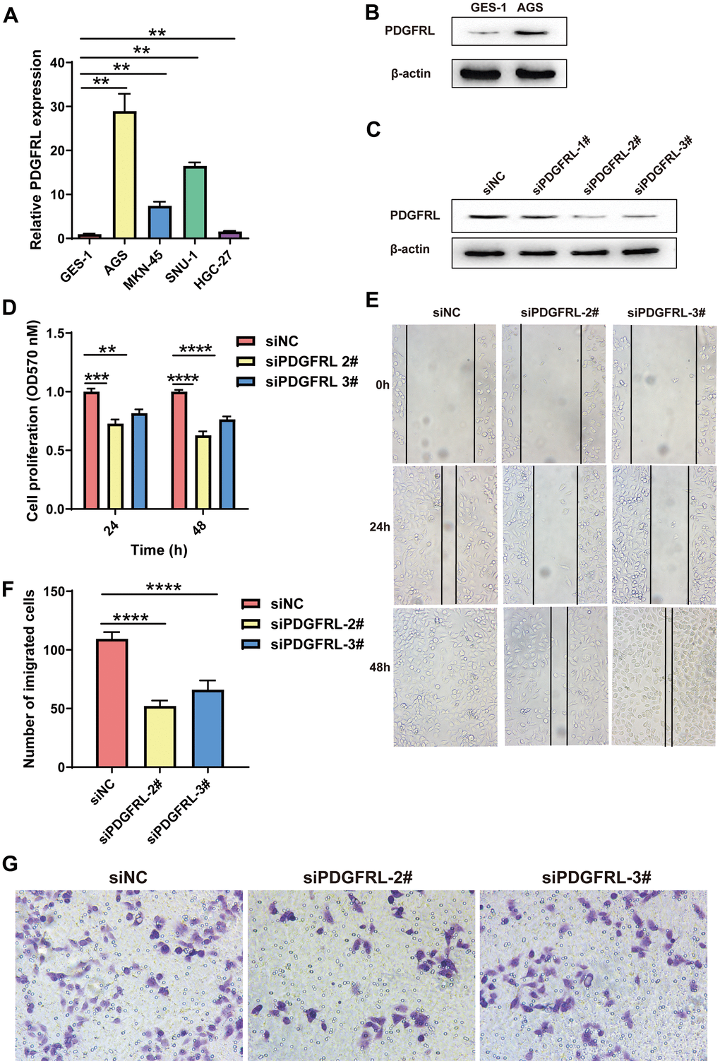 In this study, we assessed PDGFRL mRNA expression through qPCR experiments in normal gastric cells GES-1 and several GC cell lines (AGS, MKN-45, SUN-1, and HGC-27). As shown in Figure 6A, PDGFRL mRNA levels were significantly elevated in all GC cell lines compared to normal gastric cells, with AGS cells exhibiting the highest expression levels. Similarly, PDGFRL protein expression was higher in AGS cells than in GES-1 cells (Figure 6B), prompting us to select AGS cells for further functional validation.