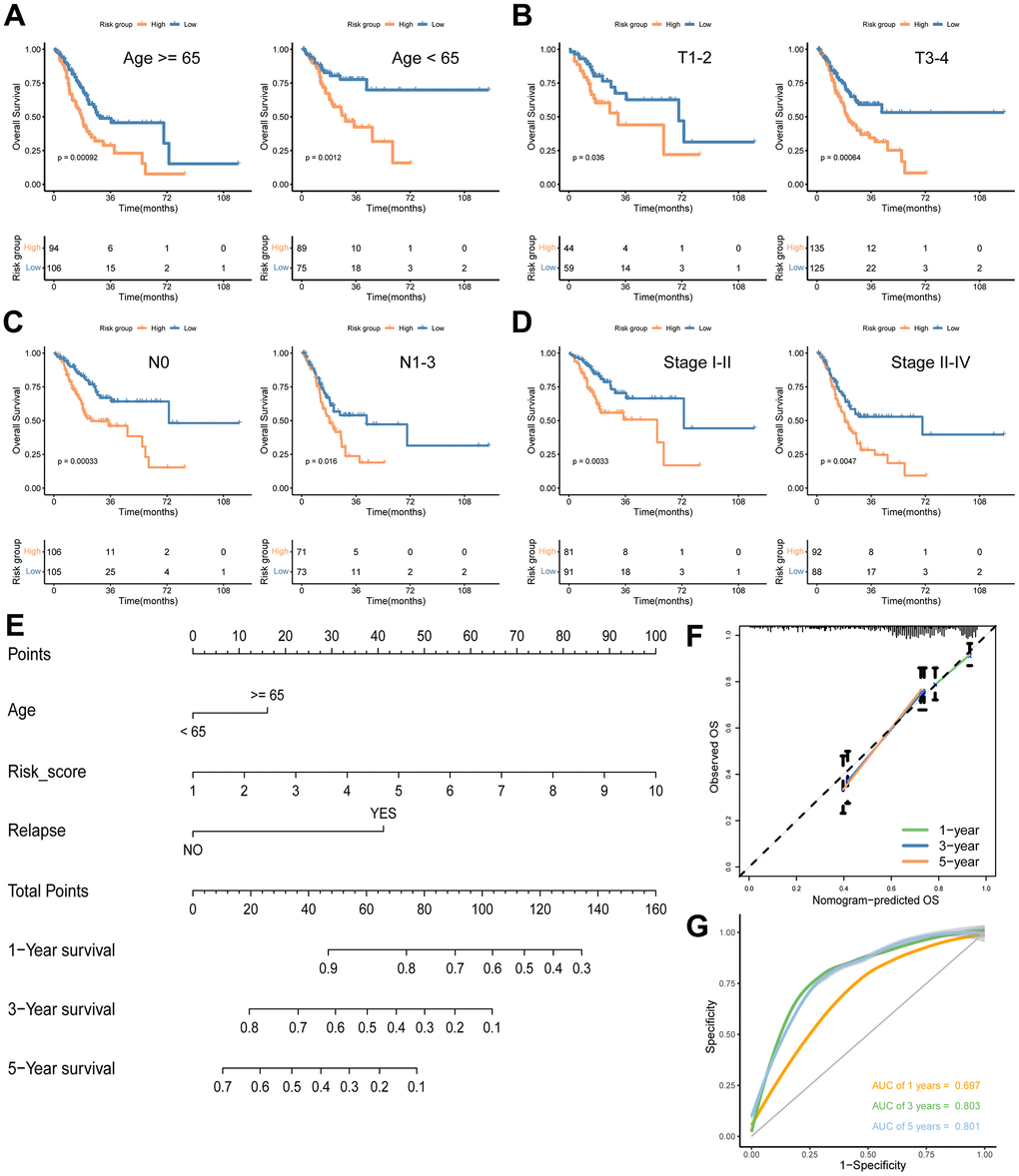 To explore the relationship between the signature risk score and various clinical characteristics, we conducted survival analyses across different clinical parameters, including age (≥ 65/< 65) (Figure 7A), T stage (T1-2/T3-4) (Figure 7B), N stage (0/1-3) (Figure 7C) and stage (I-II/III-IV) (Figure 7D). In each category, patients in the low-risk group consistently demonstrated significantly longer survival times compared to those in the high-risk group (Figure 7A–7D). Additionally, we developed a nomogram for predicting OS at 1-, 3-, and 5-year intervals, incorporating age, risk score, and relapse (Figure 7E). The performance and reliability of this nomogram were validated using calibration curves (Figure 7F) and ROC curves (Figure 7G) for each time point. The results confirmed that the nomogram accurately predicts the OS of GC patients, showcasing its clinical utility (Figure 7E–7G).