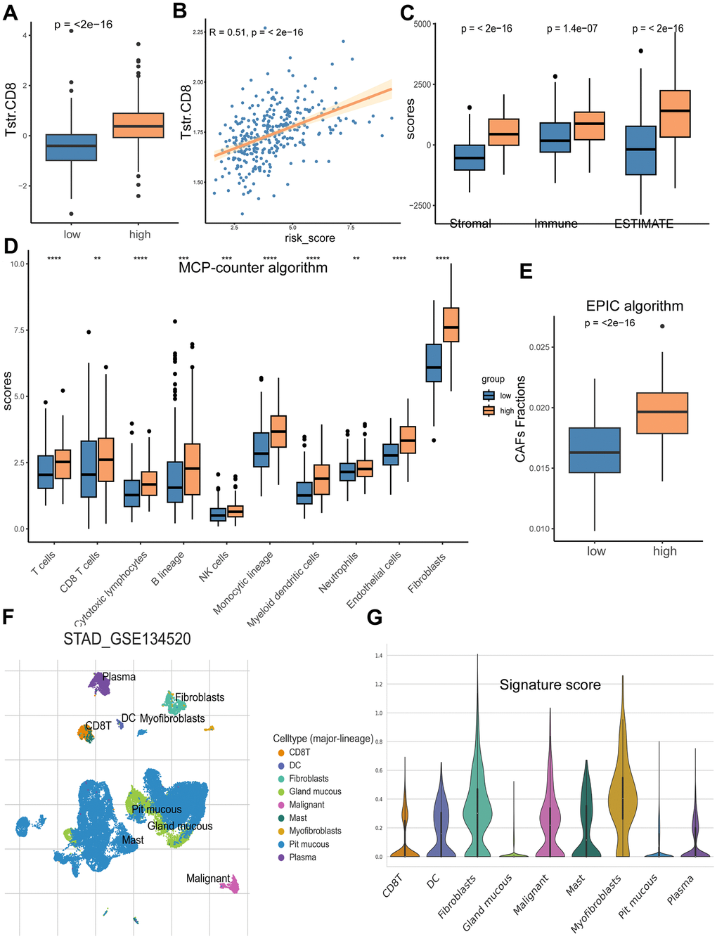 The ESTIMATE algorithm [16] was used to evaluate the levels of immune and stromal cell infiltration in GC patients. Additionally, the MCP-counter algorithm [17] assessed the levels of specific immune and stromal cell types present within the tumor tissues. To validate the differences in cancer-associated fibroblasts (CAFs) between the high-risk and low risk patient groups stratified by the eight-gene signature, the EPIC algorithm [18] was applied.