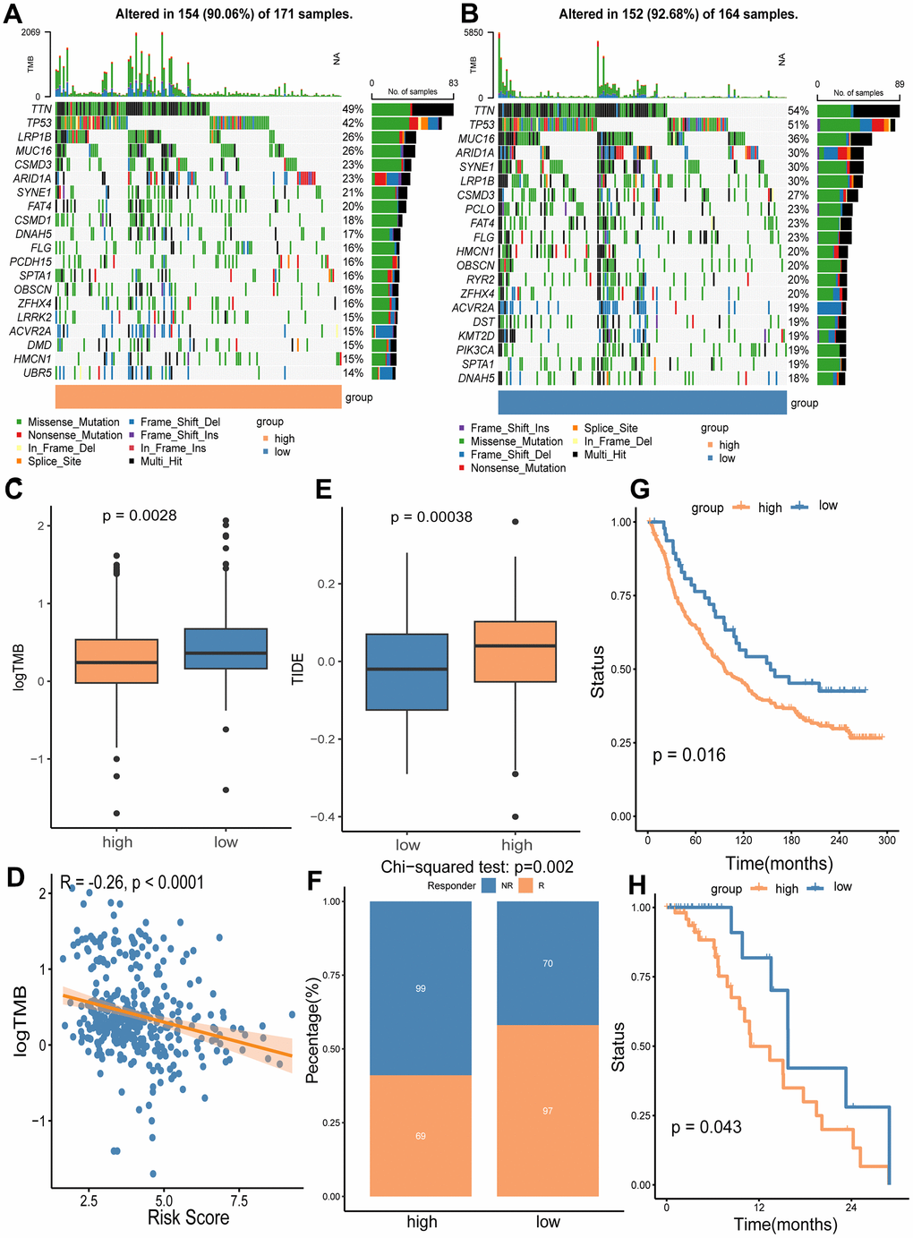 We utilized the maftools package to analyze mutation frequencies in two risk groups. Notably, the frequency of mutations in several key cancer-related genes was lower in the high-risk group compared to the low-risk group (TTN: 49% vs. 54%; TP53: 42% vs. 51%; MUC16: 26% vs. 36%; LRP1B: 26% vs. 30%) (Figure 9A, 9B). Additionally, a significant difference in TMB was observed between the groups (Figure 9C), with TMB negatively correlated with the risk score of our gene signature (Figure 9D). Given that higher TMB is associated with an increased capability to generate neo-antigens and potentially a better response to immunotherapy in various cancers, including GC [25, 26], we further investigated whether the signature risk scores could predict immunotherapeutic outcomes in GC patients. Our findings indicated that the high-risk group had a significantly higher Tumor Immune Dysfunction and Exclusion (TIDE) score (p = 0.0028) and a greater number of immunotherapy non-responders (99/168) compared to the low-risk group (70/167) (p = 0.002) (Figure 9E, 9F). Lastly, we analyzed OS using two immunotherapy cohorts (IMvigor210 and GSE176307) to examine differences between risk groups under immunotherapy. The results showed that the gene signature could distinguish GC patients well in the immunotherapy cohorts (Figure 9G, 9H).