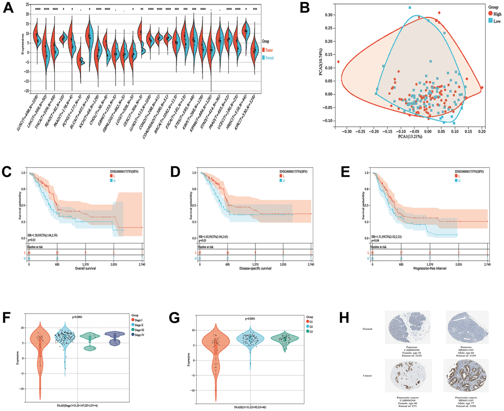 The “stats” R package was used to conduct the PCA. We used the SangerBox3.0 [58] to download the pan-cancer gene expression data via TCGA dataset and evaluated the pan-cancer expression of 14-3-3σ. The Kaplan-Meier curves of OS, DSS, PFS, and DFS were plotted using the Sangbox3.0 tool “prognostic analysis” module to assess the underlying prognostic value of the 14-3-3σ gene in PAAD. We used the “clinical stages and gene expression analysis” module to identify the relationship between the 14-3-3σ mRNA expression and the grade/stage of PAAD. We obtained the PAAD data from the TCGA GDC website [59] and assessed the relevance between 14-3-3σ and clinical features using the univariate logistic regression analysis. The GSEA was carried out to investigate the 14-3-3σ-relative biological signaling pathway in PAAD. Finally, we examined the protein expression of 14-3-3σ in PAAD and normal tissues using the HPA (http://www.proteinatlas.org/) database.