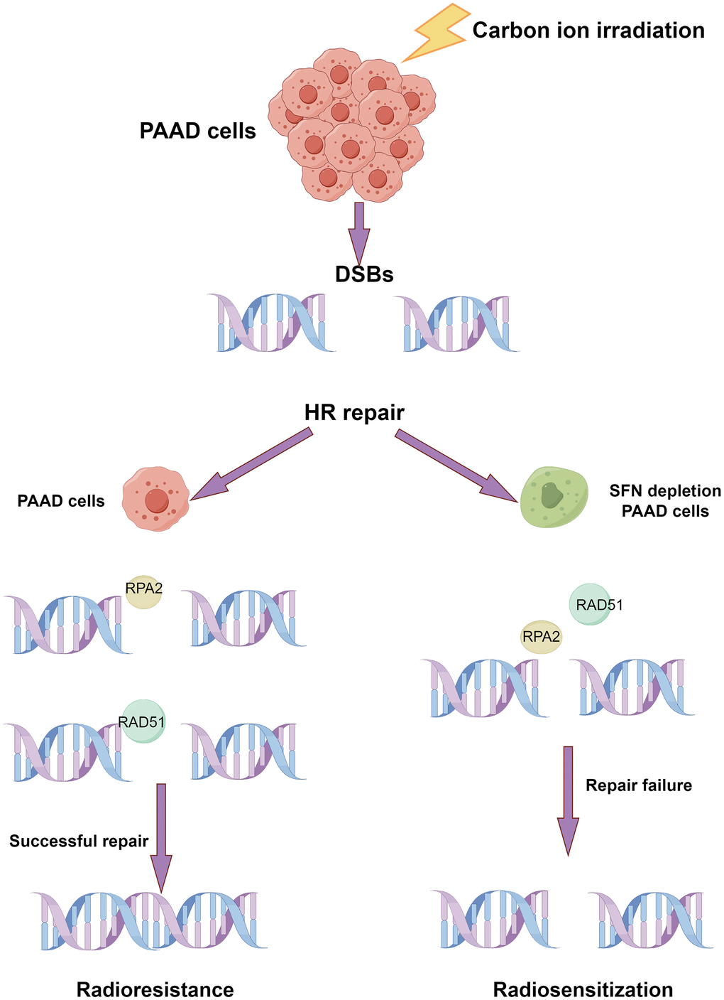 14-3-3σ depletion affects the cellular behaviors of PAAD cells following carbon ion irradiation, including proliferation inhibition, cell cycle arrest reduction, and DNA damage induction. The xenograft model implicated 14-3-3σ in a carbon ion resistance role in PAAD cells. 14-3-3σ reduced the effect of carbon ion irradiation by promoting HRR of DNA damage by negatively regulating DNA end resection (Figure 10). Therefore, 14-3-3σ is a candidate target to strengthen the radiosensitivity of PAAD to carbon ions.