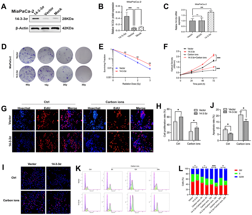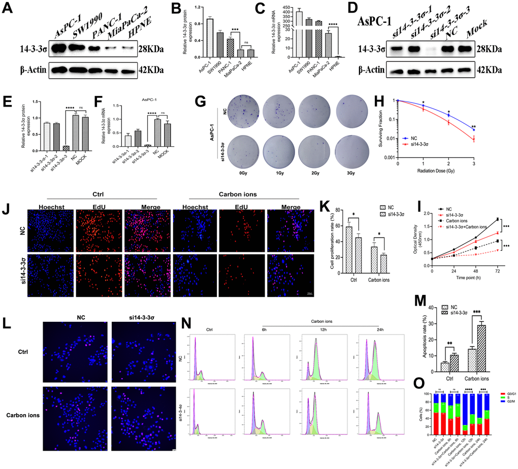 We next checked the 14-3-3σ expression in four PAAD cell lines (AsPC-1, MiaPaCa-2, PANC-1, and SW1990) and human pancreatic ductal cells (HPNE) using both immunoblotting and quantitative reverse transcriptase-polymerase chain reaction (qRT-PCR) (Figure 2A–2C). The results depicted the PAAD cells abundantly expressed 14-3-3σ. To demonstrate the specific function of 14-3-3σ in PAAD cells in combination with carbon ion radiotherapy, we constructed 14-3-3σ knockdown (AsPC-1) and overexpression (MiaPaCa-2) cells according to their expression in tested PAAD cell lines. We used siRNAs targeting the 14-3-3σ gene (si14-3-3σ group) or negative control (NC group) to generate 14-3-3σ deficient AsPC-1 cells. Simultaneously, we constructed 14-3-3σ-overexpressing MiaPaCa-2 cells (14-3-3σ group) and empty vector control cells (Vector group) and evaluated the efficiency of knockdown (Figure 2D–2F) and overexpression (Figure 3A–3C) by immunoblotting and qRT-PCR. Consistent with the bioinformatic analysis results that 14-3-3σ supports the proliferation of PAAD, its depletion reduced the colony numbers in AsPC-1 cells after carbon ion irradiation (Figure 2G, 2H and Supplementary Table 1). Notably, 14-3-3σ deficiency markedly increased the radiosensitivity by two-fold in comparison with the parent cells with 2 Gy carbon ion radiation (SF 0.07 vs. 0.17). The cell count kit 8 (CCK8) assay demonstrated that 14-3-3σ deficiency significantly restrained AsPC-1 cell proliferation, with a pronounced inhibition observed following the addition of carbon ions (Figure 2I). We observed the semblable outcomes after the 5-Ethynyl-2′-deoxyuridine (EdU) incorporation assay (Figure 2J, 2K). Afterward, we examined the effect of 14-3-3σ depletion on cell apoptosis and the cell cycle upon carbon ions. After 3 Gy carbon ion radiation, the 14-3-3σ depletion group conferred a significantly higher apoptotic rate (si14-3-3σ group: 29.13%±2.26%; NC group: 14.34%±1.48%) (Figure 2L, 2M). As 14-3-3σ is involved in the eukaryotic cell cycle progression [28, 29]. We next performed flow cytometry to evaluate the effect of 14-3-3σ knockdown on the cell cycle at 6 h, 12 h, and 24 h after carbon ions. The G2/M arrest reached the peak at 12 h after carbon ions. Although unirradiated AsPC-1 cells demonstrated a normal G2/M population upon deficiency of 14-3-3σ, the proportion of cells in the G2 phase was about 75% and 50% for the NC group and si14-3-3σ group at 12 h after 3 Gy of carbon ion radiation, respectively (Figure 2N, 2O), indicating that the 14-3-3σ depletion impaired the G2 phase arrest. Thus, the knockdown of 14-3-3σ impeded PAAD cell vitality synergistically with carbon ion irradiation.