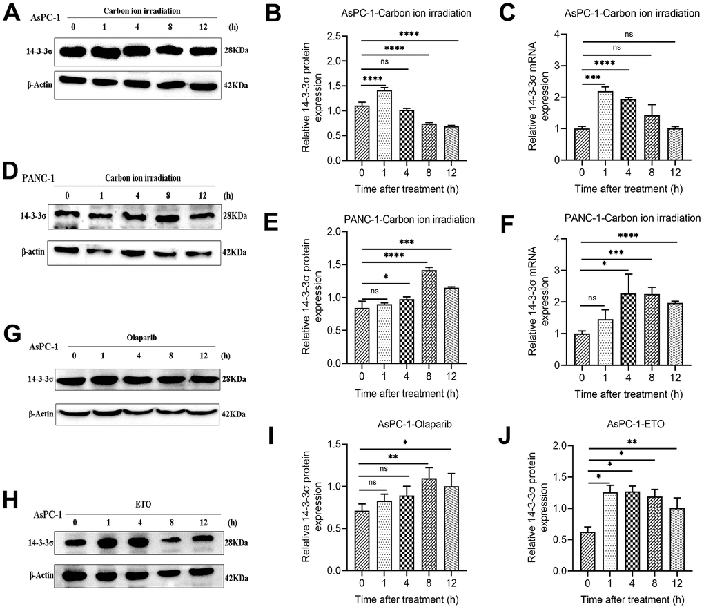 Because 14-3-3σ protects the cells from carbon ion-induced DNA damage, we evaluated 14-3-3σ expression after carbon ion irradiation and other forms of genetic damage at various time points (1, 4, 8, and 12 h) to explore the function 14-3-3σ in DDR in PAAD cells. For tested AsPC-1 and PANC-1 cells, 14-3-3σ expression was significantly enhanced at 1 h and 4 h following exposure to carbon ions and declined at 4 h and 12 h (Figure 4A–4E). The mRNA levels in AsPC-1 and PANC-1 were upregulated following carbon ion irradiation (Figure 4C, 4F). Etoposide (ETO) or olaparib can induce DNA damage and is usually clinically to treat PAAD [30, 31]. We found that AsPC-1 cells expressed a higher level of 14-3-3σ after treatment with these two agents (Figure 4G–4J), demonstrating that 14-3-3σ promoted the recovery of PAAD cells from genetic damage and thus ensured genetic stability.
