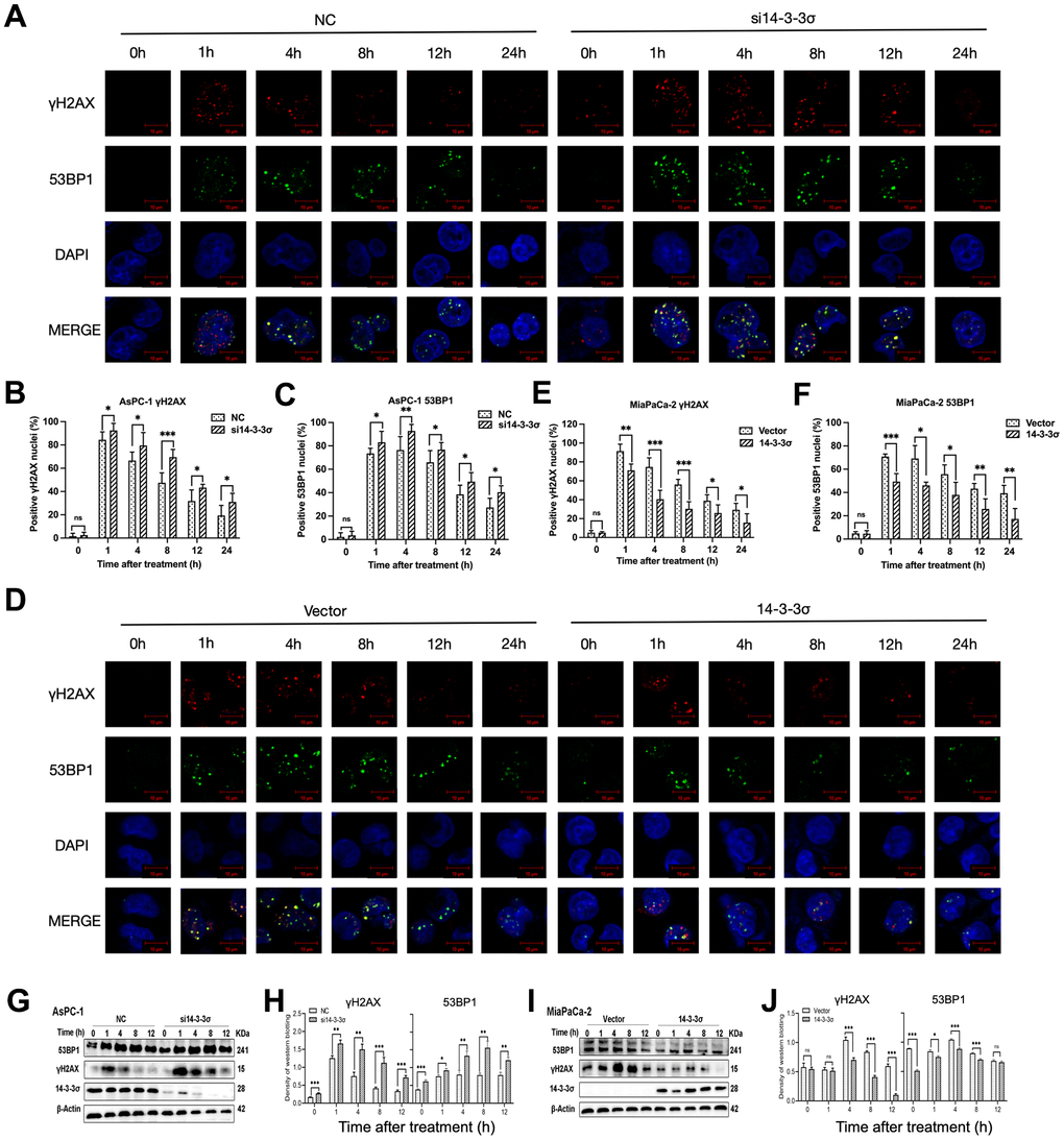We next examined the dynamic accumulation of phos-histone (γH2AX) and p53-binding protein 1 (53BP1) following irradiation with carbon ions in these cells at various time points (1, 4, 8, 12, and 24 h) to determine whether the 14-3-3σ-mediated carbon ion radioresistance was due to its effect on DNA repair. γH2AX and 53BP1 are two nuclear proteins most associated with DSB induction. 53BP1 foci are colocalized with γH2AX foci generated in the DSB-containing chromatin domains and therefore could serve as alternative markers for DSB induction and repair [32]. Confocal microscopy demonstrated that the numbers of γH2AX and 53BP1 foci had no difference between the 14-3-3σ-depleted and parental AsPC-1 cells before carbon ion irradiation. The si14-3-3σ group displayed more unresolved γH2AX and 53BP1 foci than the NC group after carbon ion irradiation (Figure 5A–5C), consistent with lower γH2AX and 53BP1 expression and lower DNA damage in 14-3-3σ-overexpressed MiaPaCa-2 cells than in the Vector group (Figure 5D–5F). Moreover, the positive cell rate (five foci or more per nucleus) of γH2AX/53BP1 in the si14-3-3σ and NC groups peaked at 1 h and 4 h, respectively (si14-3-3σ group: γH2AX: 92.49%±6.04%, 53BP1: 92.73%±5.63%; NC group: γH2AX: 84.46%±6.71%, 53BP1: 76.42%±11.48%). The percentage of positive γH2AX and 53BP1 foci cells in the 14-3-3σ knockdown group was retained up to 33.59% and 43.57% of the peak rate at 24 h after carbon ion radiation, respectively, whereas the positive rate of γH2AX and 53BP1 declined to 22.93% and 35.79% in the NC group, respectively, suggesting that 14-3-3σ reduced carbon ion-induced damage with slow repair kinetics. In line with the above results, immunoblotting demonstrated that the depletion of 14-3-3σ caused markedly increased levels of γH2AX and 53BP1 proteins and vice versa (Figure 5G–5J). The above data indicated that the depletion of 14-3-3σ impaired DSB repair capacity, thereby keeping DSBs at high levels.