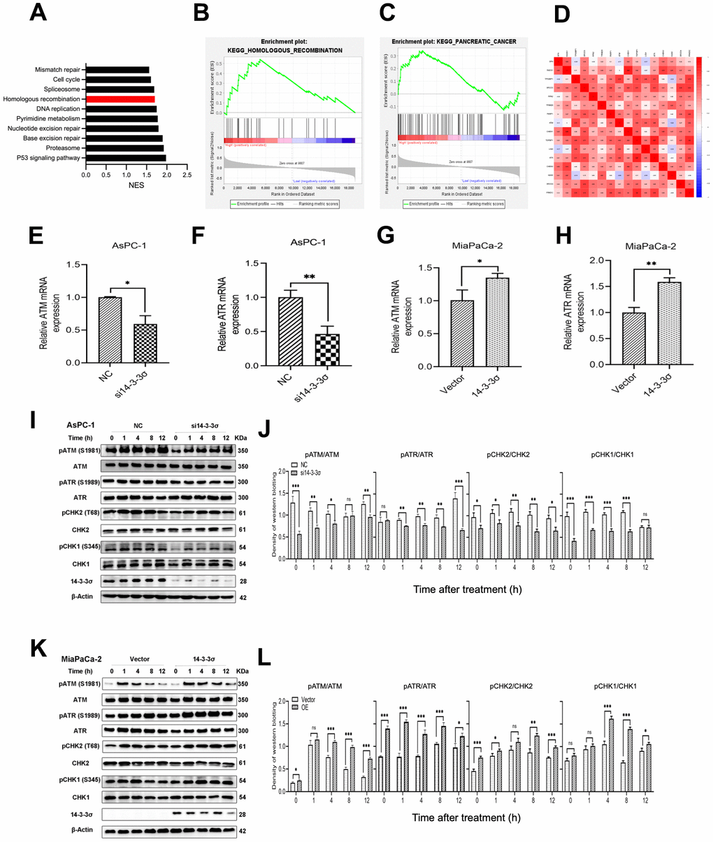 DSBs repair ability is critical for the killing effect of irradiation, and HR and NHEJ are the two key repair pathways [33]. We explored the relationship of 14-3-3σ with genes related to the HR and NHEJ pathways, and the results showed that 14-3-3σ was positively correlated with the critical HR genes, including ATR (ATM and Rad3-related), Chk1, Chk2, RAD51, and H2AX (all r>0.3, p-value<0.05) (Figure 6D). The gene set enrichment analysis (GSEA) was conducted then to investigate the specific molecular mechanism related to 14-3-3σ in PAAD, which indicated that the abundant 14-3-3σ was remarkably enriched in the HR pathway (Figure 6A–6C). Evidence has demonstrated that the NHEJ pathway is not essential for restoring clustered DSBs caused by high-LET radiation [34, 35], and carbon ion-induced DSB restoration is more dependent on the HR pathway than the repair following γ-ray or proton irradiation [36]. Thus, we hypothesized that 14-3-3σ released the damage caused by carbon ions in PAAD cells by activating the HRR pathway. Based on this assumption, we conducted qRT-PCR to examine whether 14-3-3σ affected the expression of ATM (ataxia telangiectasia mutated) and ATR, which could perceive DNA damage and activate the HR pathway. Figure 6E–6H shows the attenuated expression of ATM and ATR by deleting 14-3-3σ at the mRNA level. Correspondingly, 14-3-3σ overexpression increased the expression of both ATM and ATR mRNAs. We next extracted the proteins from cells after 3 Gy of carbon ion radiation in each group and checked the influence of 14-3-3σ on the mainstream proteins of the HR signaling pathway. Immunoblotting results demonstrated that the irradiation with carbon ions reduced the activation of phosphorylation of ATM and ATR in 14-3-3σ-depleted AsPC-1 cells (Figure 6I, 6J); in contrast, 14-3-3σ overexpressed MiaPaCa-2 cells displayed increased phosphorylation of ATM and ATR (Figure 6K, 6L). Chk2 and Chk1, downstream factors of ATM and ATR signaling pathways, respectively, were detected subsequently, as displayed in Figure 6K, 6L. We found that the phosphorylation of both Chk2 and Chk1 was attenuated with the silencing of 14-3-3σ and carbon ion irradiation. Conversely, 14-3-3σ overexpression enhanced the phosphorylation of Chk1 and Chk2 with unaffected total proteins (Figure 6K, 6L). Chk2 plays a vital role in the cell cycle course when cells confer DNA damage; its upregulation induced by the overexpression of 14-3-3σ could arrest cells at the G2-M phase and repair the damage induced by carbon ions.