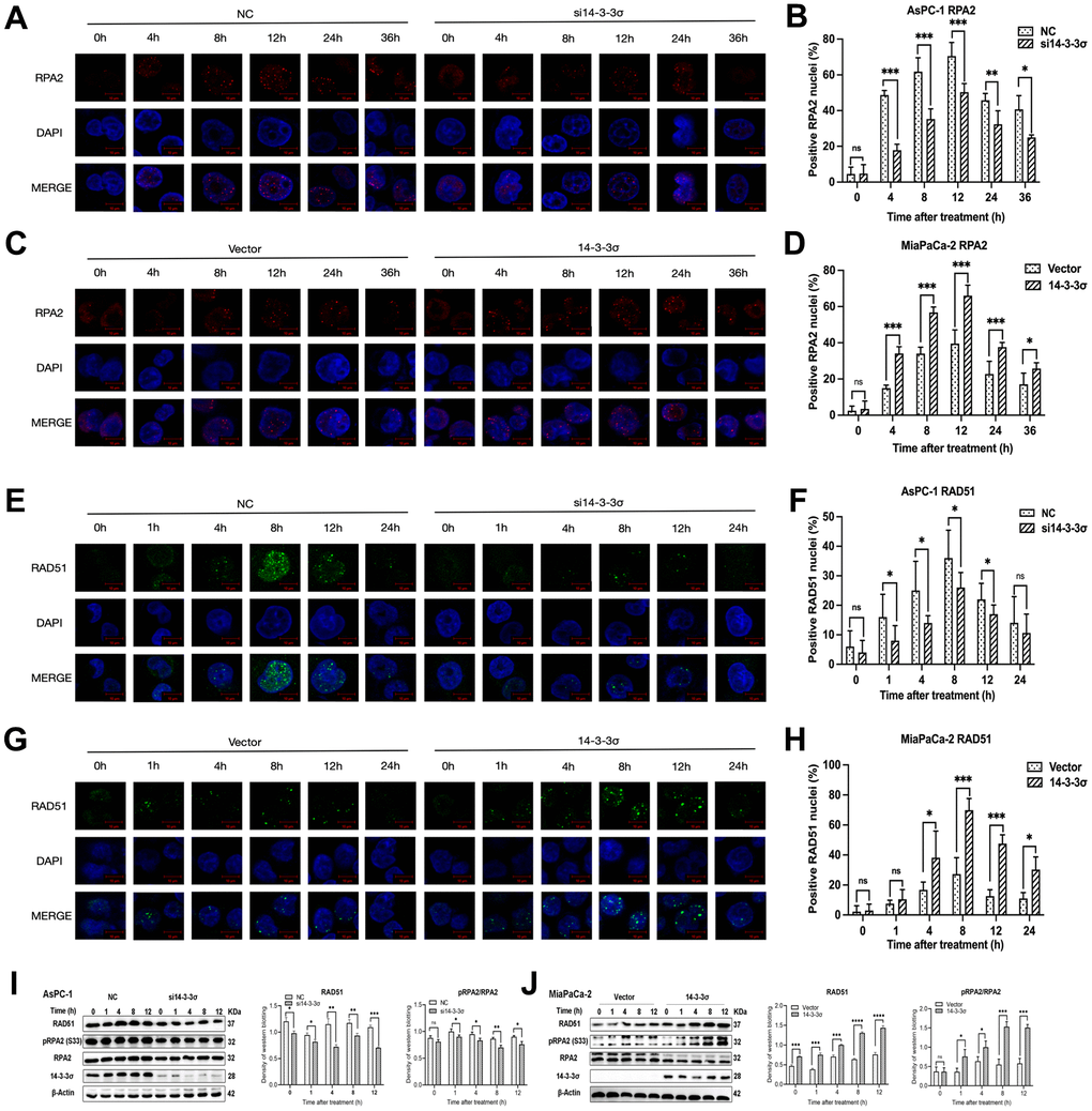 Afterward, we performed immunofluorescence (IF) to detect the effect of 14-3-3σ on the recruitment kinetics of RAD51 and RPA2 at the DSB damage site, the two key repair factors of the HRR pathway for restoring clustered DSBs. The depletion of 14-3-3σ strongly inhibited the recruitment of RPA2—a single-strand-binding protein involved in the end excision of the HR process—to DNA damage sites, implying that 14-3-3σ contributes to the end excision step of HRR (Figure 7A, 7B). Notably, the recruitment of RAD51, the main recombinase related to HRR, was mitigated in si14-3-3σ AsPC-1 cells. In contrast, these foci in the NC group remained high in number or decreased dramatically (Figure 7E, 7F). The synergistic effect of overexpressed 14-3-3σ combined with carbon ions recruited more RAD51 and RPA2 foci than that by carbon ion irradiation alone, substantially enhancing the efficiency of the HR pathway (Figure 7C, 7D, 7G, 7H). RAD51, along with the phosphorylation of RPA, can reach DSB sites early in the HR pathway. Hyperphosphorylated RPA guarantees that RAD51 interacts with RPA with higher affinities than the unphosphorylated RPA [37]. Similarly, we found that RAD51 and phosphorylation of RPA2 after carbon ion irradiation were attenuated in the 14-3-3σ depletion AsPC-1 cells and increased in the 14-3-3σ proficient group, as evident from immunoblotting results (Figure 7I, 7J). We concluded that 14-3-3σ improves the accumulation of RPA2 and RAD51, thus guaranteeing the completion of carbon ion irradiation induced HRR.