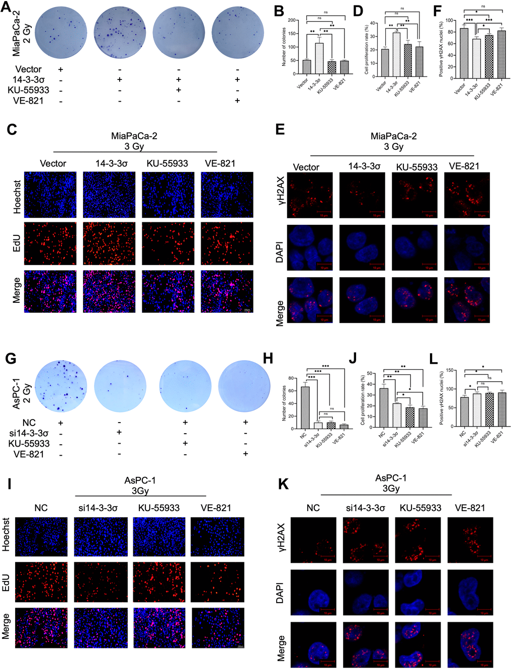 The correlation between 14-3-3σ and the HR pathway was elucidated by investigating whether 14-3-3σ-induced carbon ion radioresistance could abrogate the blocking of the HR signaling pathway. The ATR inhibitor VE-821 and ATM inhibitor KU-55933 were added to the 14-3-3σ overexpression group following carbon ion irradiation (VE-821 group, 14-3-3σ overexpression + VE-821, KU-55933 group, 14-3-3σ overexpression + KU-55933, respectively). The other two groups in this experiment were the Vector group (empty vector + DMSO) and the 14-3-3σ group (14-3-3σ overexpression + dimethyl sulfoxide [DMSO]). We first seeded 3000 cells/well to observe the colony formation ability in these four groups. As shown in Figure 8A, 8B, 14-3-3σ overexpression promoted the 2 Gy carbon ion irradiation colony formation of PAAD cells, and as expected, ATR or ATM blocking almost eliminated this phenomenon. In addition, these two inhibitors exerted equal effects. We next performed the EdU assay; compared with the Vector group, 14-3-3σ overexpression significantly enhanced the proliferation ability (proliferation rate: Vector group versus 14-3-3σ group: 20.67%±1.57% versus 32.99%±0.94%). The proliferation ability decreased with the addition of ATR inhibitor or ATM to MiaPaCa-2 cells (proliferation rate: VE-821 group: 22.48%±3.71%, KU-55933 group: 24.30%±2.86%), which exerted no statistical difference in comparison with the Vector group (Figure 8C, 8D). Finally, we studied the accumulation of γH2AX 1 h after 3 Gy carbon ion radiation. 14-3-3σ overexpression significantly decreased the formation of γH2AX signals; the γH2AX foci increased with the activation of ATR or ATM. Furthermore, the ATR pathway blocking exerted a more significant effect on 14-3-3σ-induced γH2AX accumulation than the ATM pathway blocking (Figure 8E, 8F). These data demonstrated that blocking the HR pathway, either ATR or ATM pathway, eliminated 14-3-3σ overexpression-mediated carbon ion irradiation resistance. To thoroughly verify the hypothesis that 14-3-3σ induced carbon ion radioresistance through the HR pathway, we detected the influence of 14-3-3σ depletion and ATR or ATM activation inhibition on carbon ion irradiation resistance. We created the following four groups for the subsequent studies: NC group (NC + DMSO), si14-3-3σ group (si14-3-3σ + DMSO), VE-821 group (NC + VE-821), and KU-55933 group (NC + KU-55933). The colony forming (Figure 8G, 8H) and EdU assays (Figure 8I, 8J) revealed that either the depletion of 14-3-3σ or the blocking of either ATR or ATM reduced the proliferation ability along with the radiation of carbon ion radiation. The accumulation γH2AX 1 h after 3 Gy carbon ions significantly increased in the si14-3-3σ group, VE-821 group, and KU-55933 group in comparison with the NC group (Figure 8K, 8L). Above data indicated that the 14-3-3σ could be the upstream member of the HR pathway, and both 14-3-3σ depletion and ATR/ATM inhibition could be used as therapeutic targets for PAAD carbon ion radiotherapy.